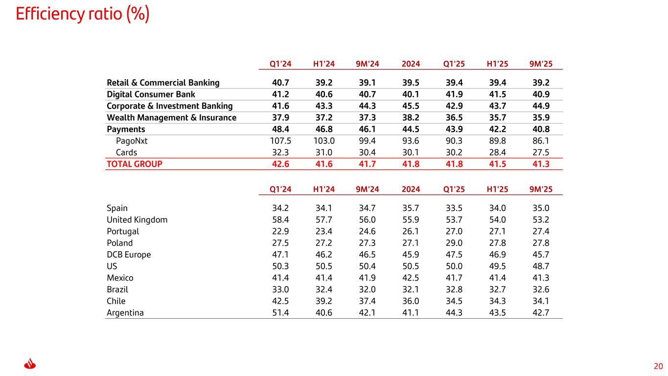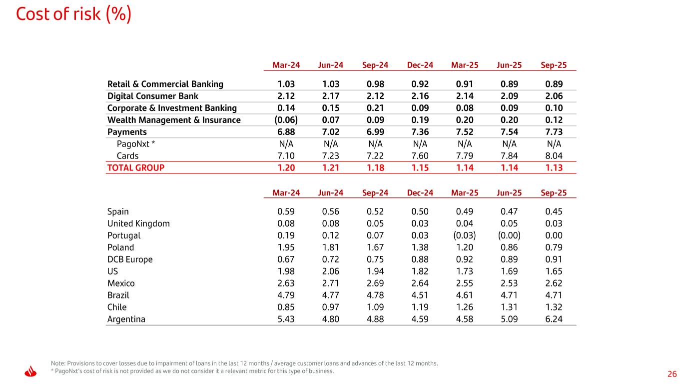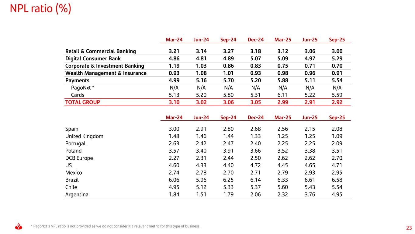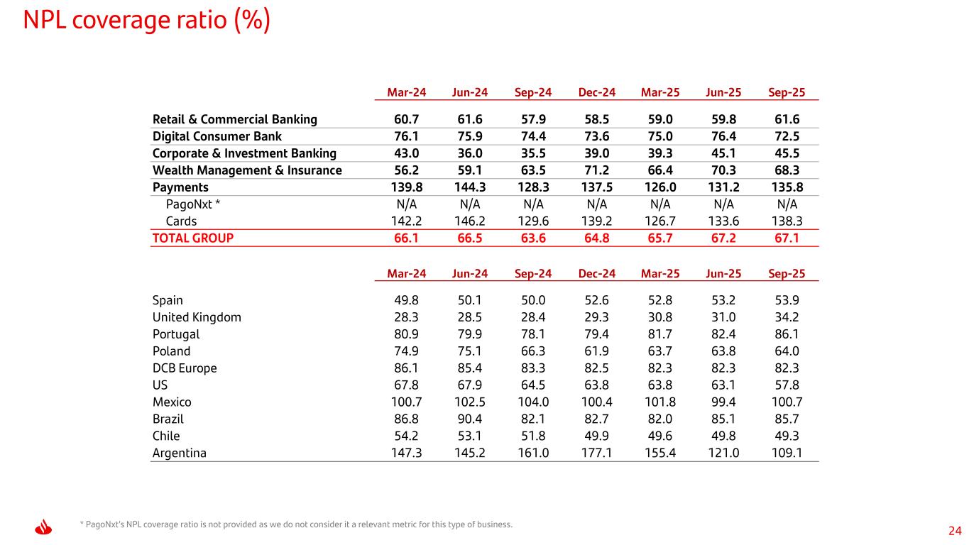 23 NPL ratio (%) Mar-24 Jun-24 Sep-24 Dec-24 Mar-25 Jun-25 Sep-25 Retail & Commercial Banking 3.21 3.14 3.27 3.18 3.12 3.06 3.00 Digital Consumer Bank 4.86 4.81 4.89 5.07 5.09 4.97 5.29 Corporate & Investment Banking 1.19 1.03 0.86 0.83 0.75 0.71 0.70 Wealth Management & Insurance 0.93 1.08 1.01 0.93 0.98 0.96 0.91 Payments 4.99 5.16 5.70 5.20 5.88 5.11 5.54 PagoNxt * N/A N/A N/A N/A N/A N/A N/A Cards 5.13 5.20 5.80 5.31 6.11 5.22 5.59 TOTAL GROUP 3.10 3.02 3.06 3.05 2.99 2.91 2.92 Mar-24 Jun-24 Sep-24 Dec-24 Mar-25 Jun-25 Sep-25 Spain 3.00 2.91 2.80 2.68 2.56 2.15 2.08 United Kingdom 1.48 1.46 1.44 1.33 1.25 1.25 1.09 Portugal 2.63 2.42 2.47 2.40 2.25 2.25 2.09 Poland 3.57 3.40 3.91 3.66 3.52 3.38 3.51 DCB Europe 2.27 2.31 2.44 2.50 2.62 2.62 2.70 US 4.60 4.33 4.40 4.72 4.45 4.65 4.71 Mexico 2.74 2.78 2.70 2.71 2.79 2.93 2.95 Brazil 6.06 5.96 6.25 6.14 6.33 6.61 6.58 Chile 4.95 5.12 5.33 5.37 5.60 5.43 5.54 Argentina 1.84 1.51 1.79 2.06 2.32 3.76 4.95 * PagoNxt's NPL ratio is not provided as we do not consider it a relevant metric for this type of business.