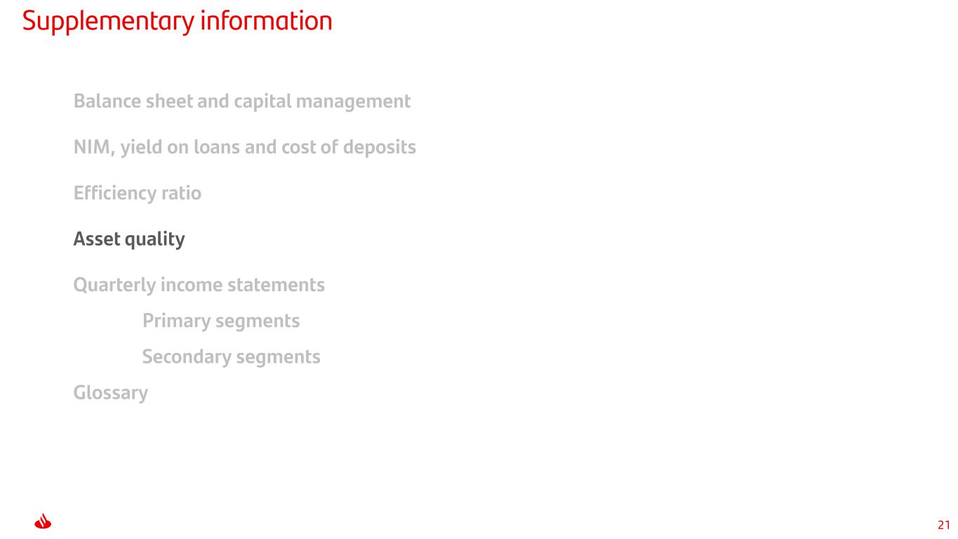 21 Supplementary information Balance sheet and capital management NIM, yield on loans and cost of deposits Efficiency ratio Asset quality Quarterly income statements Primary segments Secondary segments Glossary