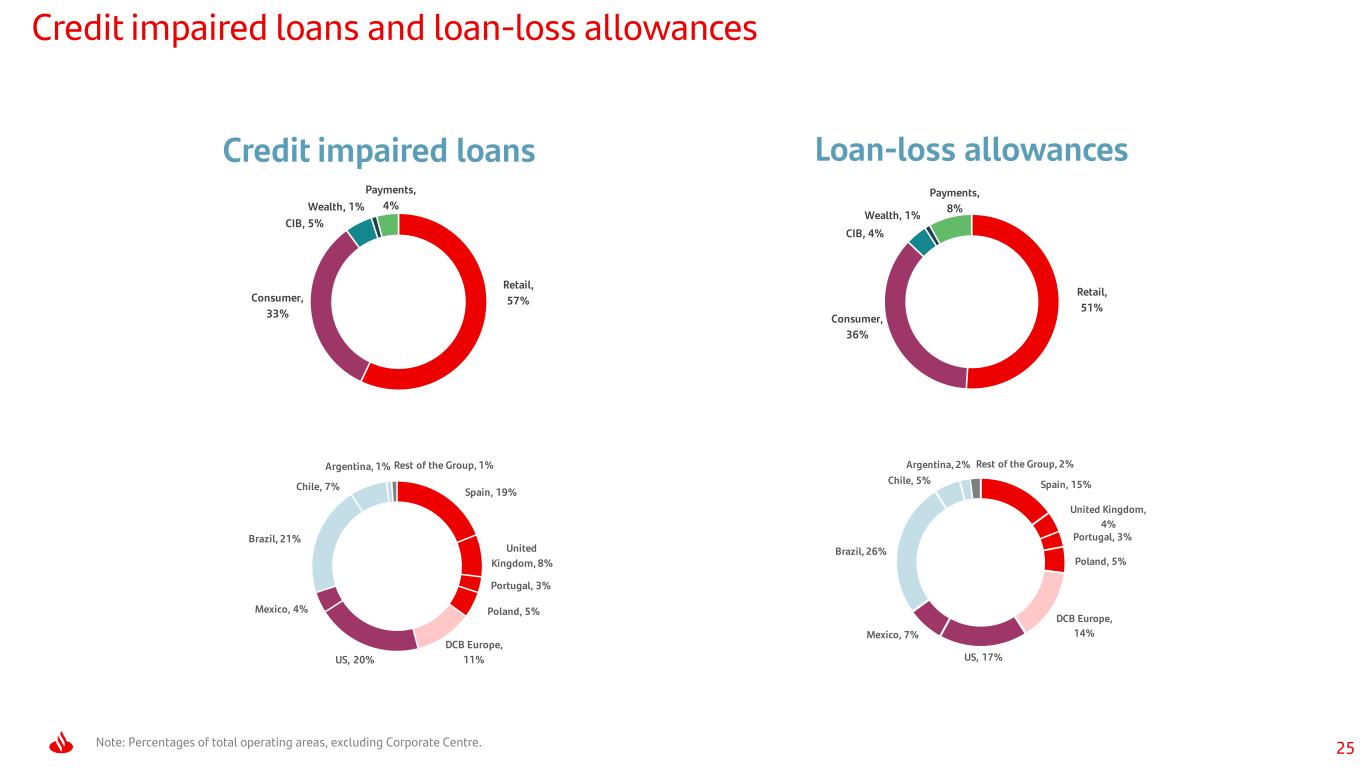 25 Loan-loss allowancesCredit impaired loans Credit impaired loans and loan-loss allowances Retail, 57%Consumer, 33% CIB, 5% Wealth, 1% Payments, 4% Retail, 51% Consumer, 36% CIB, 4% Wealth, 1% Payments, 8% Spain, 19% United Kingdom, 8% Portugal, 3% Poland, 5% DCB Europe, 11%US, 20% Mexico, 4% Brazil, 21% Chile, 7% Argentina, 1% Rest of the Group, 1% Spain, 15% United Kingdom, 4% Portugal, 3% Poland, 5% DCB Europe, 14% US, 17% Mexico, 7% Brazil, 26% Chile, 5% Argentina, 2% Rest of the Group, 2% Note: Percentages of total operating areas, excluding Corporate Centre.