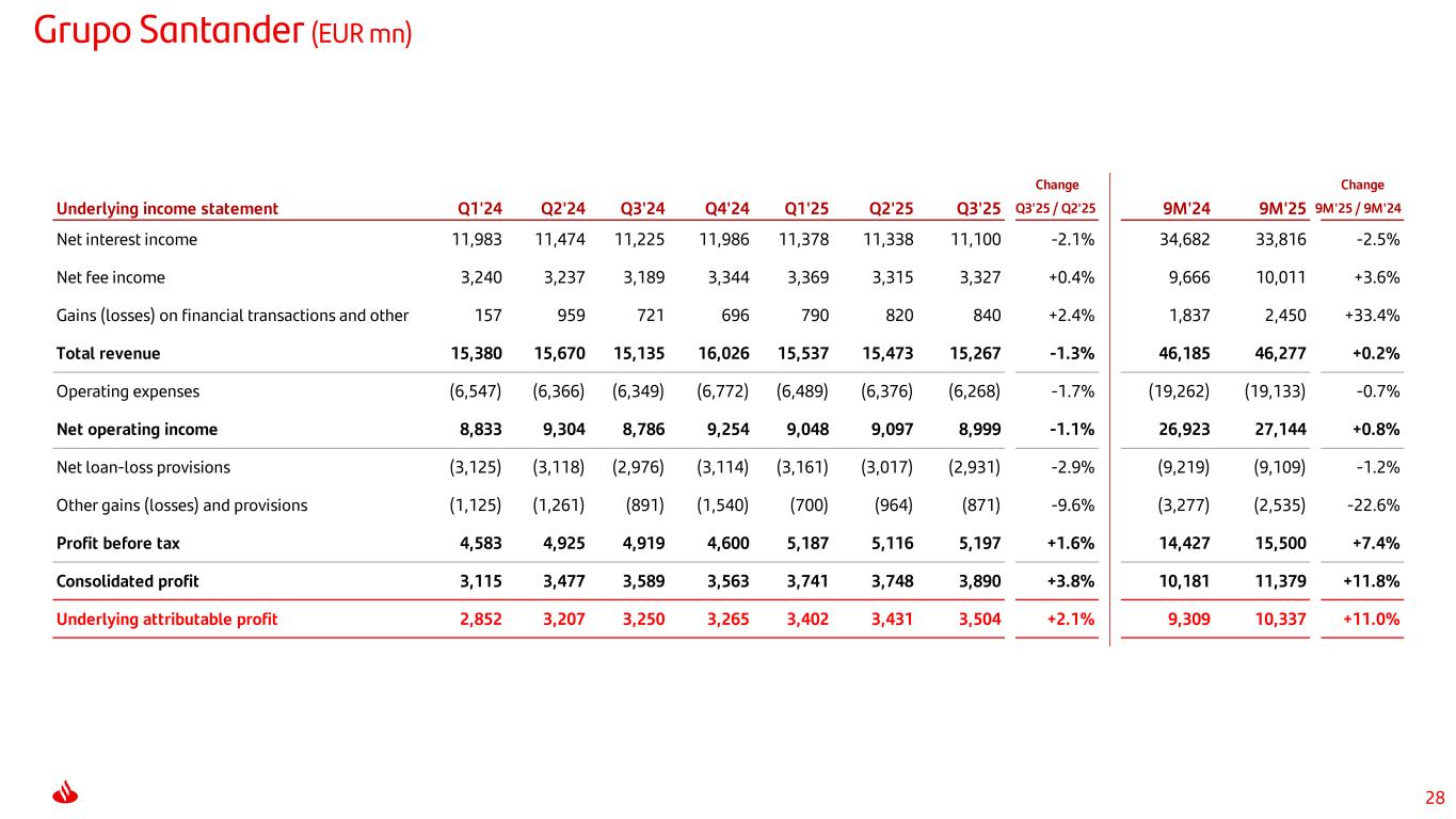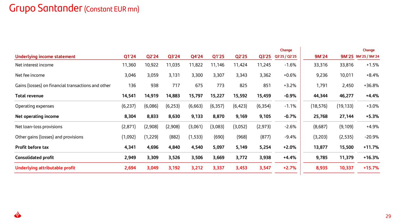28 Grupo Santander (EUR mn) Change Change Underlying income statement Q1'24 Q2'24 Q3'24 Q4'24 Q1'25 Q2'25 Q3'25 Q3'25 / Q2'25 9M'24 9M'25 9M'25 / 9M'24 Net interest income 11,983 11,474 11,225 11,986 11,378 11,338 11,100 -2.1% 34,682 33,816 -2.5% Net fee income 3,240 3,237 3,189 3,344 3,369 3,315 3,327 +0.4% 9,666 10,011 +3.6% Gains (losses) on financial transactions and other 157 959 721 696 790 820 840 +2.4% 1,837 2,450 +33.4% Total revenue 15,380 15,670 15,135 16,026 15,537 15,473 15,267 -1.3% 46,185 46,277 +0.2% Operating expenses (6,547) (6,366) (6,349) (6,772) (6,489) (6,376) (6,268) -1.7% (19,262) (19,133) -0.7% Net operating income 8,833 9,304 8,786 9,254 9,048 9,097 8,999 -1.1% 26,923 27,144 +0.8% Net loan-loss provisions (3,125) (3,118) (2,976) (3,114) (3,161) (3,017) (2,931) -2.9% (9,219) (9,109) -1.2% Other gains (losses) and provisions (1,125) (1,261) (891) (1,540) (700) (964) (871) -9.6% (3,277) (2,535) -22.6% Profit before tax 4,583 4,925 4,919 4,600 5,187 5,116 5,197 +1.6% 14,427 15,500 +7.4% Consolidated profit 3,115 3,477 3,589 3,563 3,741 3,748 3,890 +3.8% 10,181 11,379 +11.8% Underlying attributable profit 2,852 3,207 3,250 3,265 3,402 3,431 3,504 +2.1% 9,309 10,337 +11.0%