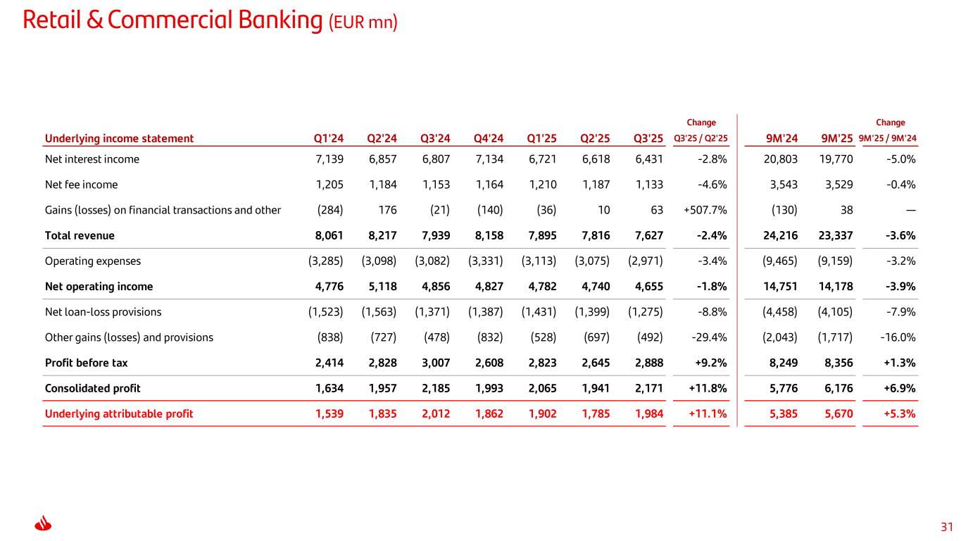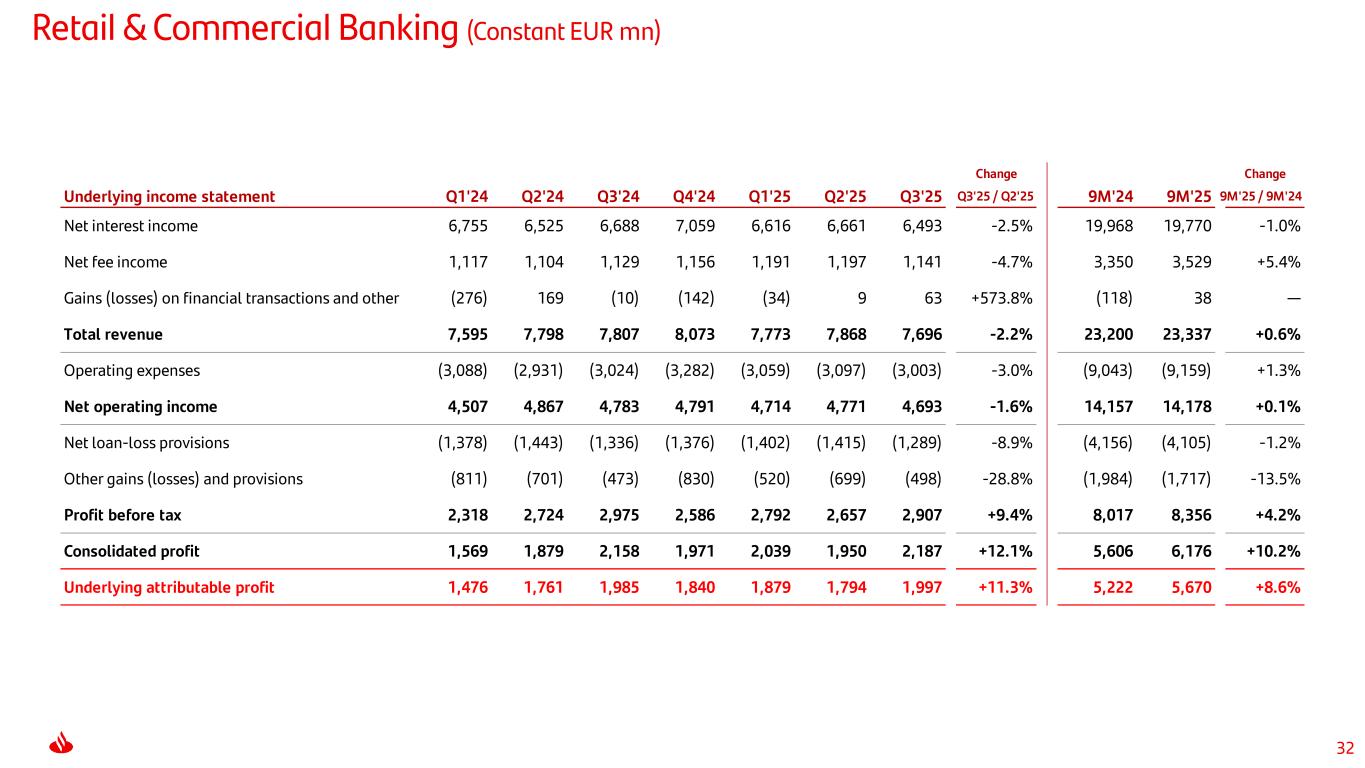 31 Retail & Commercial Banking (EUR mn) Change Change Underlying income statement Q1'24 Q2'24 Q3'24 Q4'24 Q1'25 Q2'25 Q3'25 Q3'25 / Q2'25 9M'24 9M'25 9M'25 / 9M'24 Net interest income 7,139 6,857 6,807 7,134 6,721 6,618 6,431 -2.8% 20,803 19,770 -5.0% Net fee income 1,205 1,184 1,153 1,164 1,210 1,187 1,133 -4.6% 3,543 3,529 -0.4% Gains (losses) on financial transactions and other (284) 176 (21) (140) (36) 10 63 +507.7% (130) 38 — Total revenue 8,061 8,217 7,939 8,158 7,895 7,816 7,627 -2.4% 24,216 23,337 -3.6% Operating expenses (3,285) (3,098) (3,082) (3,331) (3,113) (3,075) (2,971) -3.4% (9,465) (9,159) -3.2% Net operating income 4,776 5,118 4,856 4,827 4,782 4,740 4,655 -1.8% 14,751 14,178 -3.9% Net loan-loss provisions (1,523) (1,563) (1,371) (1,387) (1,431) (1,399) (1,275) -8.8% (4,458) (4,105) -7.9% Other gains (losses) and provisions (838) (727) (478) (832) (528) (697) (492) -29.4% (2,043) (1,717) -16.0% Profit before tax 2,414 2,828 3,007 2,608 2,823 2,645 2,888 +9.2% 8,249 8,356 +1.3% Consolidated profit 1,634 1,957 2,185 1,993 2,065 1,941 2,171 +11.8% 5,776 6,176 +6.9% Underlying attributable profit 1,539 1,835 2,012 1,862 1,902 1,785 1,984 +11.1% 5,385 5,670 +5.3%