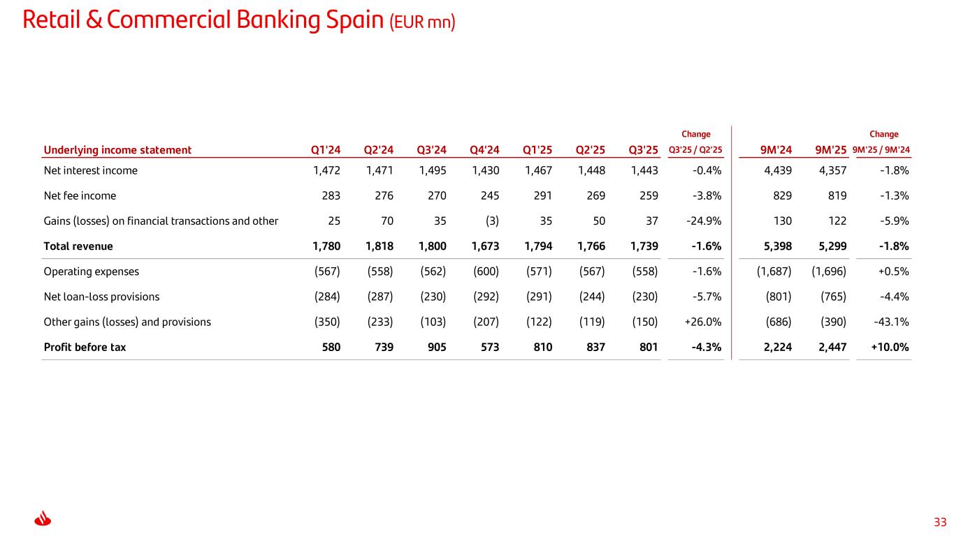 32 Retail & Commercial Banking (Constant EUR mn) Change Change Underlying income statement Q1'24 Q2'24 Q3'24 Q4'24 Q1'25 Q2'25 Q3'25 Q3'25 / Q2'25 9M'24 9M'25 9M'25 / 9M'24 Net interest income 6,755 6,525 6,688 7,059 6,616 6,661 6,493 -2.5% 19,968 19,770 -1.0% Net fee income 1,117 1,104 1,129 1,156 1,191 1,197 1,141 -4.7% 3,350 3,529 +5.4% Gains (losses) on financial transactions and other (276) 169 (10) (142) (34) 9 63 +573.8% (118) 38 — Total revenue 7,595 7,798 7,807 8,073 7,773 7,868 7,696 -2.2% 23,200 23,337 +0.6% Operating expenses (3,088) (2,931) (3,024) (3,282) (3,059) (3,097) (3,003) -3.0% (9,043) (9,159) +1.3% Net operating income 4,507 4,867 4,783 4,791 4,714 4,771 4,693 -1.6% 14,157 14,178 +0.1% Net loan-loss provisions (1,378) (1,443) (1,336) (1,376) (1,402) (1,415) (1,289) -8.9% (4,156) (4,105) -1.2% Other gains (losses) and provisions (811) (701) (473) (830) (520) (699) (498) -28.8% (1,984) (1,717) -13.5% Profit before tax 2,318 2,724 2,975 2,586 2,792 2,657 2,907 +9.4% 8,017 8,356 +4.2% Consolidated profit 1,569 1,879 2,158 1,971 2,039 1,950 2,187 +12.1% 5,606 6,176 +10.2% Underlying attributable profit 1,476 1,761 1,985 1,840 1,879 1,794 1,997 +11.3% 5,222 5,670 +8.6%