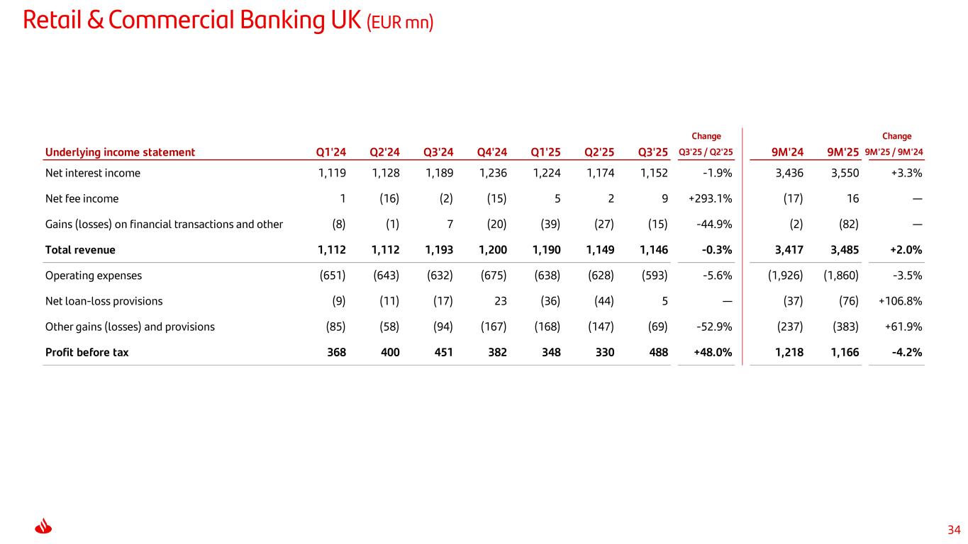 33 Retail & Commercial Banking Spain (EUR mn) Change Change Underlying income statement Q1'24 Q2'24 Q3'24 Q4'24 Q1'25 Q2'25 Q3'25 Q3'25 / Q2'25 9M'24 9M'25 9M'25 / 9M'24 Net interest income 1,472 1,471 1,495 1,430 1,467 1,448 1,443 -0.4% 4,439 4,357 -1.8% Net fee income 283 276 270 245 291 269 259 -3.8% 829 819 -1.3% Gains (losses) on financial transactions and other 25 70 35 (3) 35 50 37 -24.9% 130 122 -5.9% Total revenue 1,780 1,818 1,800 1,673 1,794 1,766 1,739 -1.6% 5,398 5,299 -1.8% Operating expenses (567) (558) (562) (600) (571) (567) (558) -1.6% (1,687) (1,696) +0.5% Net loan-loss provisions (284) (287) (230) (292) (291) (244) (230) -5.7% (801) (765) -4.4% Other gains (losses) and provisions (350) (233) (103) (207) (122) (119) (150) +26.0% (686) (390) -43.1% Profit before tax 580 739 905 573 810 837 801 -4.3% 2,224 2,447 +10.0%