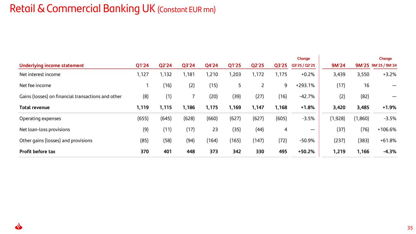 34 Retail & Commercial Banking UK (EUR mn) Change Change Underlying income statement Q1'24 Q2'24 Q3'24 Q4'24 Q1'25 Q2'25 Q3'25 Q3'25 / Q2'25 9M'24 9M'25 9M'25 / 9M'24 Net interest income 1,119 1,128 1,189 1,236 1,224 1,174 1,152 -1.9% 3,436 3,550 +3.3% Net fee income 1 (16) (2) (15) 5 2 9 +293.1% (17) 16 — Gains (losses) on financial transactions and other (8) (1) 7 (20) (39) (27) (15) -44.9% (2) (82) — Total revenue 1,112 1,112 1,193 1,200 1,190 1,149 1,146 -0.3% 3,417 3,485 +2.0% Operating expenses (651) (643) (632) (675) (638) (628) (593) -5.6% (1,926) (1,860) -3.5% Net loan-loss provisions (9) (11) (17) 23 (36) (44) 5 — (37) (76) +106.8% Other gains (losses) and provisions (85) (58) (94) (167) (168) (147) (69) -52.9% (237) (383) +61.9% Profit before tax 368 400 451 382 348 330 488 +48.0% 1,218 1,166 -4.2%