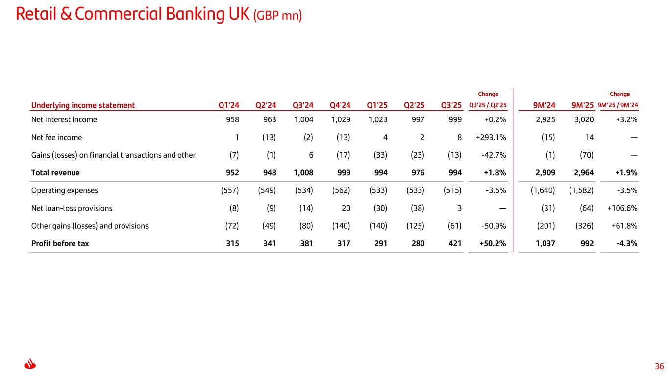 35 Retail & Commercial Banking UK (Constant EUR mn) Change Change Underlying income statement Q1'24 Q2'24 Q3'24 Q4'24 Q1'25 Q2'25 Q3'25 Q3'25 / Q2'25 9M'24 9M'25 9M'25 / 9M'24 Net interest income 1,127 1,132 1,181 1,210 1,203 1,172 1,175 +0.2% 3,439 3,550 +3.2% Net fee income 1 (16) (2) (15) 5 2 9 +293.1% (17) 16 — Gains (losses) on financial transactions and other (8) (1) 7 (20) (39) (27) (16) -42.7% (2) (82) — Total revenue 1,119 1,115 1,186 1,175 1,169 1,147 1,168 +1.8% 3,420 3,485 +1.9% Operating expenses (655) (645) (628) (660) (627) (627) (605) -3.5% (1,928) (1,860) -3.5% Net loan-loss provisions (9) (11) (17) 23 (35) (44) 4 — (37) (76) +106.6% Other gains (losses) and provisions (85) (58) (94) (164) (165) (147) (72) -50.9% (237) (383) +61.8% Profit before tax 370 401 448 373 342 330 495 +50.2% 1,219 1,166 -4.3%