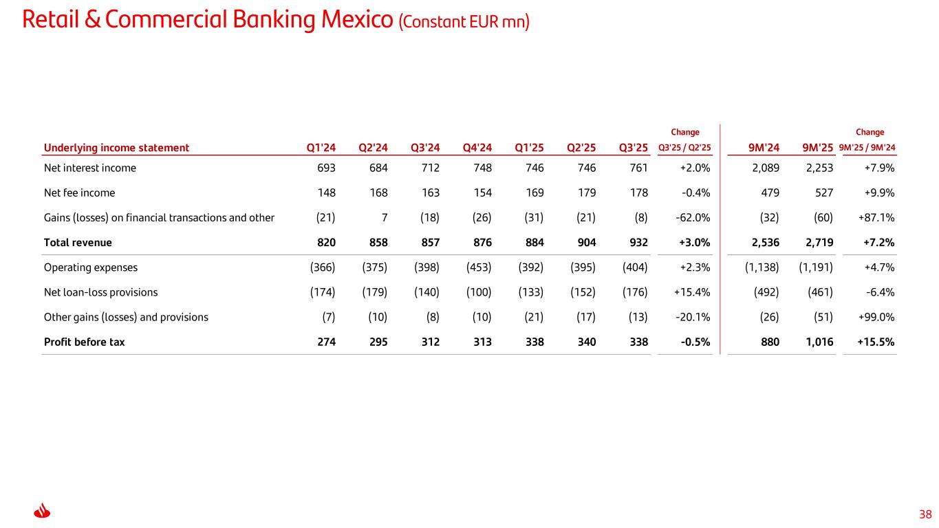 37 Retail & Commercial Banking Mexico (EUR mn) Change Change Underlying income statement Q1'24 Q2'24 Q3'24 Q4'24 Q1'25 Q2'25 Q3'25 Q3'25 / Q2'25 9M'24 9M'25 9M'25 / 9M'24 Net interest income 819 804 747 765 756 735 762 +3.6% 2,369 2,253 -4.9% Net fee income 175 197 171 156 171 177 179 +1.1% 544 527 -3.1% Gains (losses) on financial transactions and other (25) 8 (20) (28) (31) (21) (8) -61.1% (37) (60) +65.0% Total revenue 969 1,009 899 893 896 891 932 +4.6% 2,876 2,719 -5.5% Operating expenses (432) (440) (418) (467) (397) (390) (405) +3.9% (1,291) (1,191) -7.7% Net loan-loss provisions (205) (211) (143) (96) (135) (150) (176) +17.0% (558) (461) -17.5% Other gains (losses) and provisions (9) (12) (9) (10) (22) (16) (13) -18.5% (29) (51) +75.5% Profit before tax 323 346 328 320 343 335 338 +1.1% 998 1,016 +1.8%