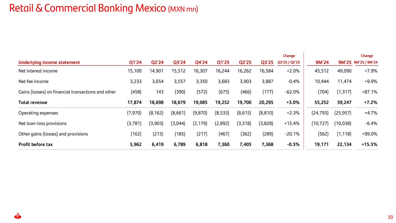 39 Retail & Commercial Banking Mexico (MXN mn) Change Change Underlying income statement Q1'24 Q2'24 Q3'24 Q4'24 Q1'25 Q2'25 Q3'25 Q3'25 / Q2'25 9M'24 9M'25 9M'25 / 9M'24 Net interest income 15,100 14,901 15,512 16,307 16,244 16,262 16,584 +2.0% 45,512 49,090 +7.9% Net fee income 3,233 3,654 3,557 3,350 3,683 3,903 3,887 -0.4% 10,444 11,474 +9.9% Gains (losses) on financial transactions and other (458) 143 (390) (572) (675) (466) (177) -62.0% (704) (1,317) +87.1% Total revenue 17,874 18,698 18,679 19,085 19,252 19,700 20,295 +3.0% 55,252 59,247 +7.2% Operating expenses (7,970) (8,162) (8,661) (9,870) (8,533) (8,615) (8,810) +2.3% (24,793) (25,957) +4.7% Net loan-loss provisions (3,781) (3,903) (3,044) (2,179) (2,892) (3,318) (3,828) +15.4% (10,727) (10,038) -6.4% Other gains (losses) and provisions (162) (215) (185) (217) (467) (362) (289) -20.1% (562) (1,118) +99.0% Profit before tax 5,962 6,419 6,789 6,818 7,360 7,405 7,368 -0.5% 19,171 22,134 +15.5%