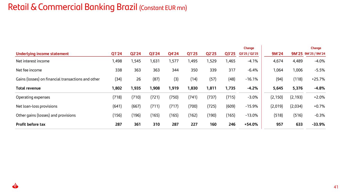 40 Retail & Commercial Banking Brazil (EUR mn) Change Change Underlying income statement Q1'24 Q2'24 Q3'24 Q4'24 Q1'25 Q2'25 Q3'25 Q3'25 / Q2'25 9M'24 9M'25 9M'25 / 9M'24 Net interest income 1,759 1,740 1,695 1,600 1,534 1,503 1,452 -3.3% 5,194 4,489 -13.6% Net fee income 397 409 376 348 359 333 314 -5.6% 1,183 1,006 -14.9% Gains (losses) on financial transactions and other (40) 31 (96) (1) (15) (57) (47) -16.6% (105) (118) +13.1% Total revenue 2,117 2,180 1,975 1,948 1,878 1,779 1,719 -3.3% 6,272 5,376 -14.3% Operating expenses (843) (799) (746) (763) (761) (724) (709) -2.1% (2,389) (2,193) -8.2% Net loan-loss provisions (753) (751) (740) (730) (718) (713) (603) -15.4% (2,244) (2,034) -9.3% Other gains (losses) and provisions (184) (222) (170) (167) (166) (187) (163) -12.5% (576) (516) -10.3% Profit before tax 337 408 319 288 233 156 244 +57.1% 1,064 633 -40.5%