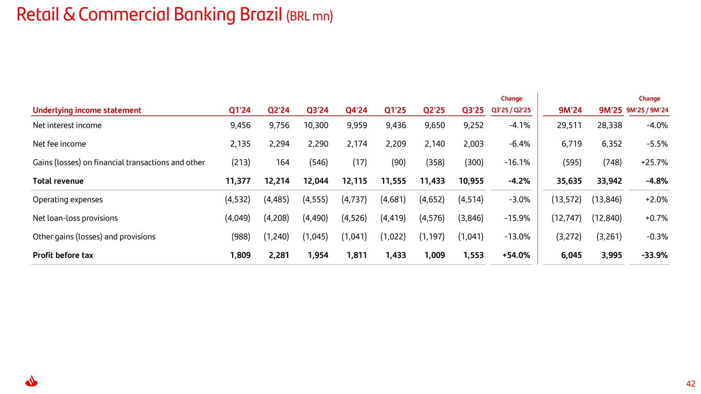 41 Retail & Commercial Banking Brazil (Constant EUR mn) Change Change Underlying income statement Q1'24 Q2'24 Q3'24 Q4'24 Q1'25 Q2'25 Q3'25 Q3'25 / Q2'25 9M'24 9M'25 9M'25 / 9M'24 Net interest income 1,498 1,545 1,631 1,577 1,495 1,529 1,465 -4.1% 4,674 4,489 -4.0% Net fee income 338 363 363 344 350 339 317 -6.4% 1,064 1,006 -5.5% Gains (losses) on financial transactions and other (34) 26 (87) (3) (14) (57) (48) -16.1% (94) (118) +25.7% Total revenue 1,802 1,935 1,908 1,919 1,830 1,811 1,735 -4.2% 5,645 5,376 -4.8% Operating expenses (718) (710) (721) (750) (741) (737) (715) -3.0% (2,150) (2,193) +2.0% Net loan-loss provisions (641) (667) (711) (717) (700) (725) (609) -15.9% (2,019) (2,034) +0.7% Other gains (losses) and provisions (156) (196) (165) (165) (162) (190) (165) -13.0% (518) (516) -0.3% Profit before tax 287 361 310 287 227 160 246 +54.0% 957 633 -33.9%