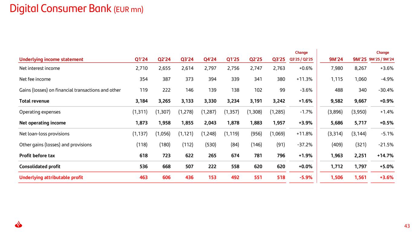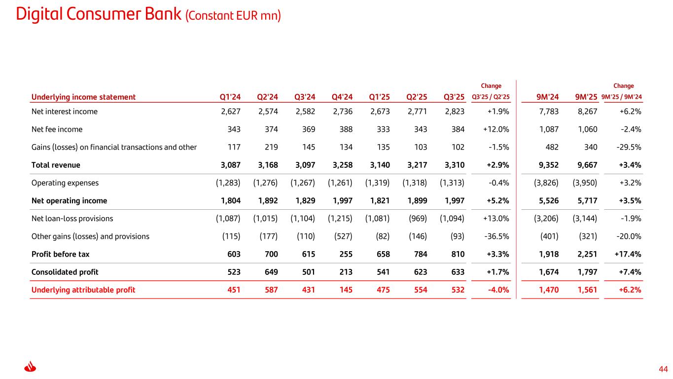 43 Digital Consumer Bank (EUR mn) Change Change Underlying income statement Q1'24 Q2'24 Q3'24 Q4'24 Q1'25 Q2'25 Q3'25 Q3'25 / Q2'25 9M'24 9M'25 9M'25 / 9M'24 Net interest income 2,710 2,655 2,614 2,797 2,756 2,747 2,763 +0.6% 7,980 8,267 +3.6% Net fee income 354 387 373 394 339 341 380 +11.3% 1,115 1,060 -4.9% Gains (losses) on financial transactions and other 119 222 146 139 138 102 99 -3.6% 488 340 -30.4% Total revenue 3,184 3,265 3,133 3,330 3,234 3,191 3,242 +1.6% 9,582 9,667 +0.9% Operating expenses (1,311) (1,307) (1,278) (1,287) (1,357) (1,308) (1,285) -1.7% (3,896) (3,950) +1.4% Net operating income 1,873 1,958 1,855 2,043 1,878 1,883 1,957 +3.9% 5,686 5,717 +0.5% Net loan-loss provisions (1,137) (1,056) (1,121) (1,248) (1,119) (956) (1,069) +11.8% (3,314) (3,144) -5.1% Other gains (losses) and provisions (118) (180) (112) (530) (84) (146) (91) -37.2% (409) (321) -21.5% Profit before tax 618 723 622 265 674 781 796 +1.9% 1,963 2,251 +14.7% Consolidated profit 536 668 507 222 558 620 620 +0.0% 1,712 1,797 +5.0% Underlying attributable profit 463 606 436 153 492 551 518 -5.9% 1,506 1,561 +3.6%