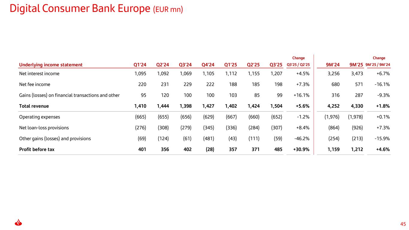 44 Digital Consumer Bank (Constant EUR mn) Change Change Underlying income statement Q1'24 Q2'24 Q3'24 Q4'24 Q1'25 Q2'25 Q3'25 Q3'25 / Q2'25 9M'24 9M'25 9M'25 / 9M'24 Net interest income 2,627 2,574 2,582 2,736 2,673 2,771 2,823 +1.9% 7,783 8,267 +6.2% Net fee income 343 374 369 388 333 343 384 +12.0% 1,087 1,060 -2.4% Gains (losses) on financial transactions and other 117 219 145 134 135 103 102 -1.5% 482 340 -29.5% Total revenue 3,087 3,168 3,097 3,258 3,140 3,217 3,310 +2.9% 9,352 9,667 +3.4% Operating expenses (1,283) (1,276) (1,267) (1,261) (1,319) (1,318) (1,313) -0.4% (3,826) (3,950) +3.2% Net operating income 1,804 1,892 1,829 1,997 1,821 1,899 1,997 +5.2% 5,526 5,717 +3.5% Net loan-loss provisions (1,087) (1,015) (1,104) (1,215) (1,081) (969) (1,094) +13.0% (3,206) (3,144) -1.9% Other gains (losses) and provisions (115) (177) (110) (527) (82) (146) (93) -36.5% (401) (321) -20.0% Profit before tax 603 700 615 255 658 784 810 +3.3% 1,918 2,251 +17.4% Consolidated profit 523 649 501 213 541 623 633 +1.7% 1,674 1,797 +7.4% Underlying attributable profit 451 587 431 145 475 554 532 -4.0% 1,470 1,561 +6.2%