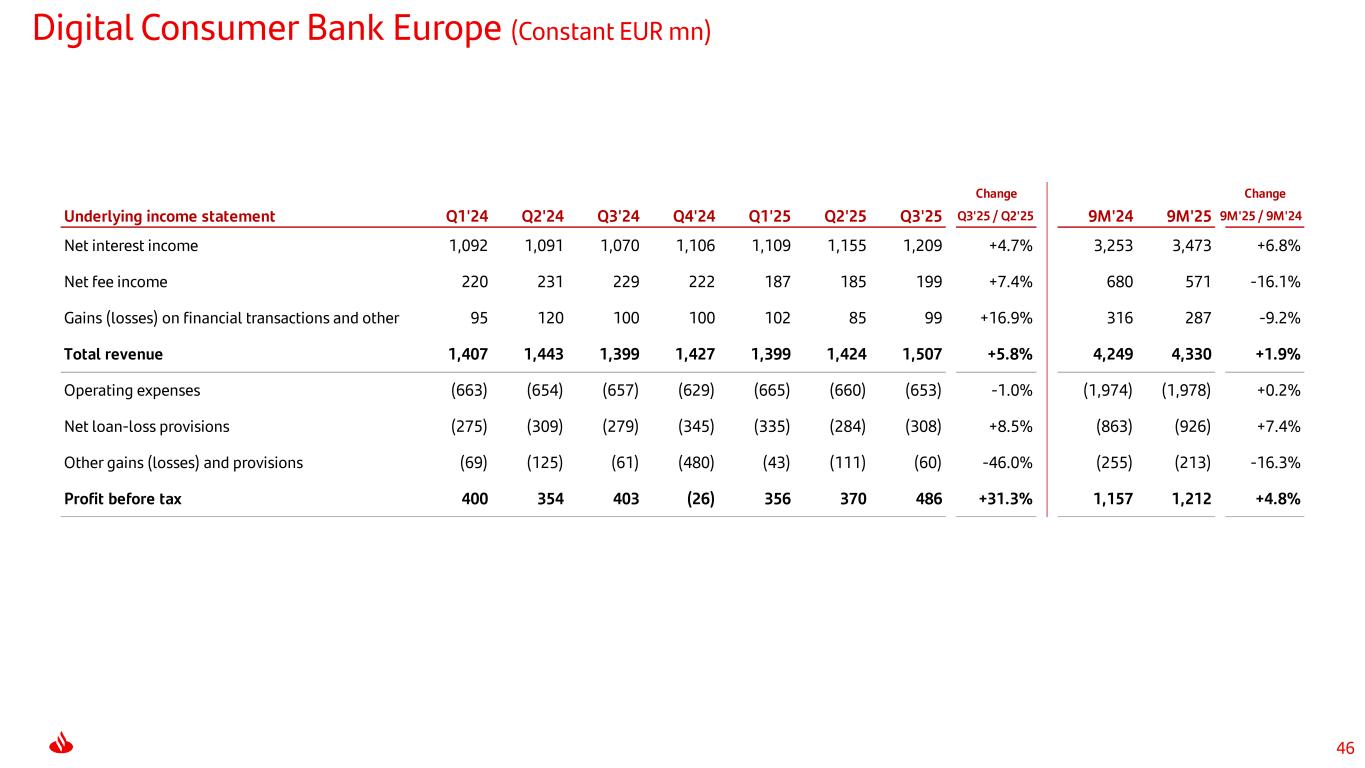 45 Digital Consumer Bank Europe (EUR mn) Change Change Underlying income statement Q1'24 Q2'24 Q3'24 Q4'24 Q1'25 Q2'25 Q3'25 Q3'25 / Q2'25 9M'24 9M'25 9M'25 / 9M'24 Net interest income 1,095 1,092 1,069 1,105 1,112 1,155 1,207 +4.5% 3,256 3,473 +6.7% Net fee income 220 231 229 222 188 185 198 +7.3% 680 571 -16.1% Gains (losses) on financial transactions and other 95 120 100 100 103 85 99 +16.1% 316 287 -9.3% Total revenue 1,410 1,444 1,398 1,427 1,402 1,424 1,504 +5.6% 4,252 4,330 +1.8% Operating expenses (665) (655) (656) (629) (667) (660) (652) -1.2% (1,976) (1,978) +0.1% Net loan-loss provisions (276) (308) (279) (345) (336) (284) (307) +8.4% (864) (926) +7.3% Other gains (losses) and provisions (69) (124) (61) (481) (43) (111) (59) -46.2% (254) (213) -15.9% Profit before tax 401 356 402 (28) 357 371 485 +30.9% 1,159 1,212 +4.6%