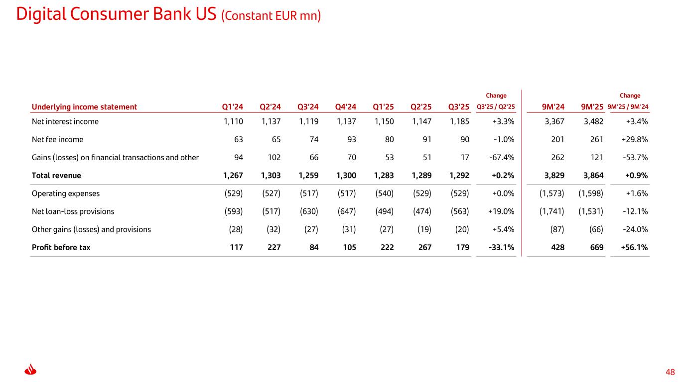 47 Digital Consumer Bank US (EUR mn) Change Change Underlying income statement Q1'24 Q2'24 Q3'24 Q4'24 Q1'25 Q2'25 Q3'25 Q3'25 / Q2'25 9M'24 9M'25 9M'25 / 9M'24 Net interest income 1,143 1,179 1,138 1,191 1,221 1,129 1,132 +0.2% 3,460 3,482 +0.6% Net fee income 64 67 75 97 84 90 86 -4.3% 206 261 +26.3% Gains (losses) on financial transactions and other 97 106 66 74 57 50 14 -71.7% 269 121 -54.9% Total revenue 1,304 1,352 1,279 1,361 1,362 1,270 1,232 -3.0% 3,935 3,864 -1.8% Operating expenses (545) (547) (525) (542) (574) (520) (504) -3.1% (1,617) (1,598) -1.2% Net loan-loss provisions (610) (537) (641) (677) (524) (466) (541) +16.2% (1,789) (1,531) -14.4% Other gains (losses) and provisions (28) (33) (28) (32) (28) (19) (19) +3.0% (89) (66) -26.1% Profit before tax 121 235 85 111 236 265 168 -36.8% 440 669 +51.8%