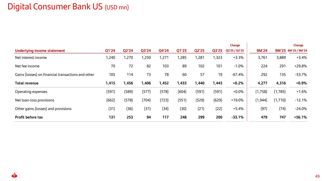 48 Digital Consumer Bank US (Constant EUR mn) Change Change Underlying income statement Q1'24 Q2'24 Q3'24 Q4'24 Q1'25 Q2'25 Q3'25 Q3'25 / Q2'25 9M'24 9M'25 9M'25 / 9M'24 Net interest income 1,110 1,137 1,119 1,137 1,150 1,147 1,185 +3.3% 3,367 3,482 +3.4% Net fee income 63 65 74 93 80 91 90 -1.0% 201 261 +29.8% Gains (losses) on financial transactions and other 94 102 66 70 53 51 17 -67.4% 262 121 -53.7% Total revenue 1,267 1,303 1,259 1,300 1,283 1,289 1,292 +0.2% 3,829 3,864 +0.9% Operating expenses (529) (527) (517) (517) (540) (529) (529) +0.0% (1,573) (1,598) +1.6% Net loan-loss provisions (593) (517) (630) (647) (494) (474) (563) +19.0% (1,741) (1,531) -12.1% Other gains (losses) and provisions (28) (32) (27) (31) (27) (19) (20) +5.4% (87) (66) -24.0% Profit before tax 117 227 84 105 222 267 179 -33.1% 428 669 +56.1%