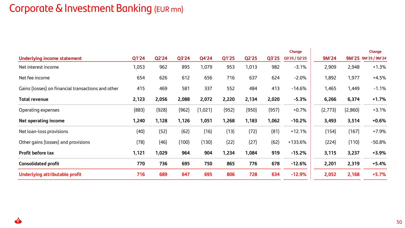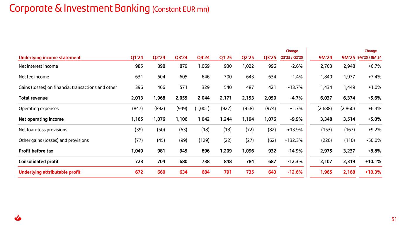 50 Corporate & Investment Banking (EUR mn) Change Change Underlying income statement Q1'24 Q2'24 Q3'24 Q4'24 Q1'25 Q2'25 Q3'25 Q3'25 / Q2'25 9M'24 9M'25 9M'25 / 9M'24 Net interest income 1,053 962 895 1,079 953 1,013 982 -3.1% 2,909 2,948 +1.3% Net fee income 654 626 612 656 716 637 624 -2.0% 1,892 1,977 +4.5% Gains (losses) on financial transactions and other 415 469 581 337 552 484 413 -14.6% 1,465 1,449 -1.1% Total revenue 2,123 2,056 2,088 2,072 2,220 2,134 2,020 -5.3% 6,266 6,374 +1.7% Operating expenses (883) (928) (962) (1,021) (952) (950) (957) +0.7% (2,773) (2,860) +3.1% Net operating income 1,240 1,128 1,126 1,051 1,268 1,183 1,062 -10.2% 3,493 3,514 +0.6% Net loan-loss provisions (40) (52) (62) (16) (13) (72) (81) +12.1% (154) (167) +7.9% Other gains (losses) and provisions (78) (46) (100) (130) (22) (27) (62) +133.6% (224) (110) -50.8% Profit before tax 1,121 1,029 964 904 1,234 1,084 919 -15.2% 3,115 3,237 +3.9% Consolidated profit 770 736 695 750 865 776 678 -12.6% 2,201 2,319 +5.4% Underlying attributable profit 716 689 647 695 806 728 634 -12.9% 2,052 2,168 +5.7%