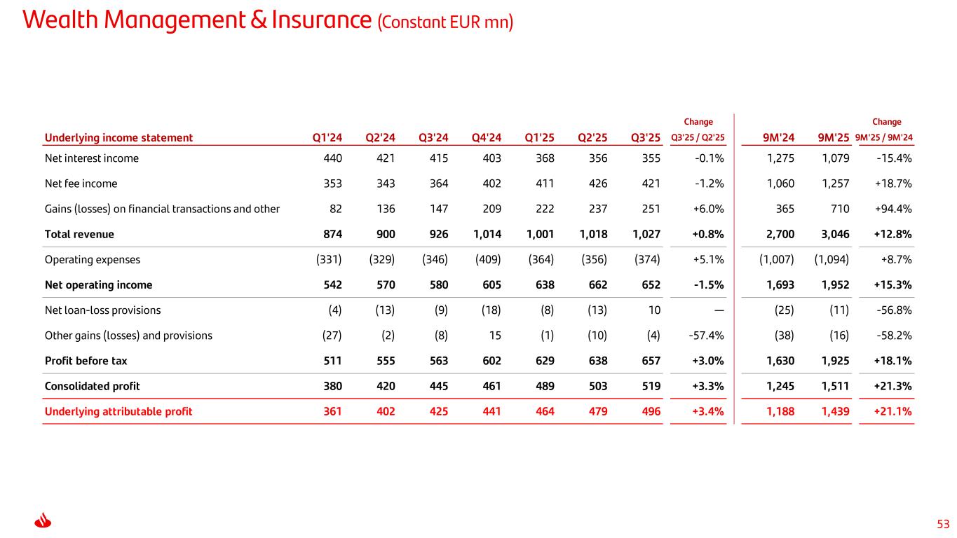 52 Wealth Management & Insurance (EUR mn) Change Change Underlying income statement Q1'24 Q2'24 Q3'24 Q4'24 Q1'25 Q2'25 Q3'25 Q3'25 / Q2'25 9M'24 9M'25 9M'25 / 9M'24 Net interest income 449 430 419 408 375 354 350 -0.9% 1,298 1,079 -16.9% Net fee income 365 356 369 408 419 423 415 -2.0% 1,090 1,257 +15.4% Gains (losses) on financial transactions and other 91 146 152 211 225 235 249 +5.9% 389 710 +82.3% Total revenue 905 932 940 1,027 1,019 1,012 1,014 +0.2% 2,777 3,046 +9.7% Operating expenses (343) (341) (351) (417) (372) (354) (369) +4.2% (1,035) (1,094) +5.7% Net operating income 562 591 589 610 647 659 646 -1.9% 1,742 1,952 +12.1% Net loan-loss provisions (4) (13) (9) (18) (8) (13) 10 — (26) (11) -57.6% Other gains (losses) and provisions (27) (2) (8) 15 (1) (10) (5) -55.9% (38) (16) -58.3% Profit before tax 531 575 572 606 639 635 651 +2.5% 1,678 1,925 +14.7% Consolidated profit 396 437 452 465 497 500 514 +2.8% 1,286 1,511 +17.5% Underlying attributable profit 376 418 433 445 471 477 491 +3.0% 1,227 1,439 +17.3%