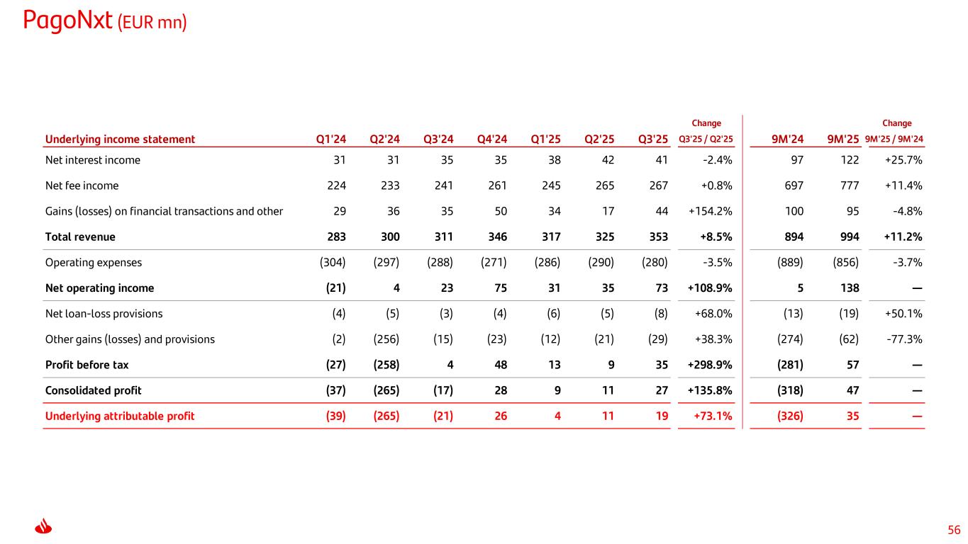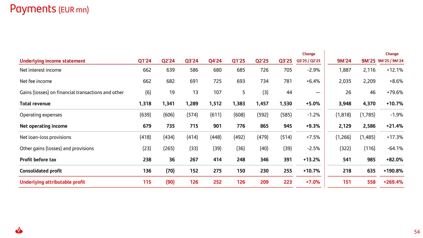 55 Payments (Constant EUR mn) Change Change Underlying income statement Q1'24 Q2'24 Q3'24 Q4'24 Q1'25 Q2'25 Q3'25 Q3'25 / Q2'25 9M'24 9M'25 9M'25 / 9M'24 Net interest income 584 572 565 668 671 734 710 -3.3% 1,722 2,116 +22.9% Net fee income 603 632 672 712 681 741 787 +6.3% 1,908 2,209 +15.8% Gains (losses) on financial transactions and other (5) 22 14 100 5 (3) 44 — 31 46 +50.0% Total revenue 1,182 1,226 1,251 1,480 1,357 1,471 1,542 +4.8% 3,660 4,370 +19.4% Operating expenses (600) (572) (565) (607) (600) (596) (588) -1.3% (1,737) (1,785) +2.7% Net operating income 583 654 686 873 757 875 953 +8.9% 1,922 2,586 +34.5% Net loan-loss provisions (362) (387) (398) (437) (481) (485) (518) +6.7% (1,147) (1,485) +29.5% Other gains (losses) and provisions (22) (265) (33) (38) (35) (41) (40) -2.3% (319) (116) -63.8% Profit before tax 199 2 256 398 240 349 396 +13.2% 456 985 +115.9% Consolidated profit 112 (92) 145 264 145 232 257 +11.0% 165 635 +284.8% Underlying attributable profit 93 (110) 120 242 122 211 226 +7.1% 102 558 +446.4%