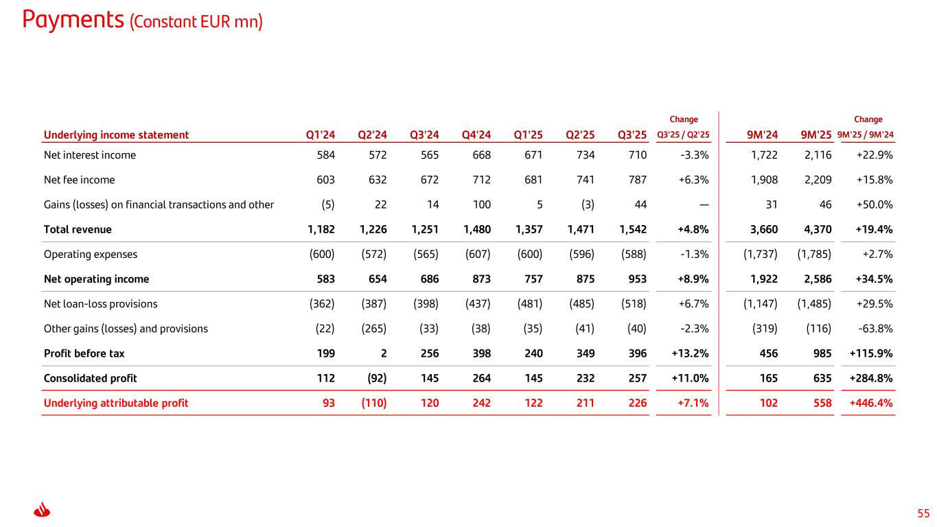 54 Payments (EUR mn) Change Change Underlying income statement Q1'24 Q2'24 Q3'24 Q4'24 Q1'25 Q2'25 Q3'25 Q3'25 / Q2'25 9M'24 9M'25 9M'25 / 9M'24 Net interest income 662 639 586 680 685 726 705 -2.9% 1,887 2,116 +12.1% Net fee income 662 682 691 725 693 734 781 +6.4% 2,035 2,209 +8.6% Gains (losses) on financial transactions and other (6) 19 13 107 5 (3) 44 — 26 46 +79.6% Total revenue 1,318 1,341 1,289 1,512 1,383 1,457 1,530 +5.0% 3,948 4,370 +10.7% Operating expenses (639) (606) (574) (611) (608) (592) (585) -1.2% (1,818) (1,785) -1.9% Net operating income 679 735 715 901 776 865 945 +9.3% 2,129 2,586 +21.4% Net loan-loss provisions (418) (434) (414) (448) (492) (479) (514) +7.5% (1,266) (1,485) +17.3% Other gains (losses) and provisions (23) (265) (33) (39) (36) (40) (39) -2.5% (322) (116) -64.1% Profit before tax 238 36 267 414 248 346 391 +13.2% 541 985 +82.0% Consolidated profit 136 (70) 152 275 150 230 255 +10.7% 218 635 +190.8% Underlying attributable profit 115 (90) 126 252 126 209 223 +7.0% 151 558 +269.4%