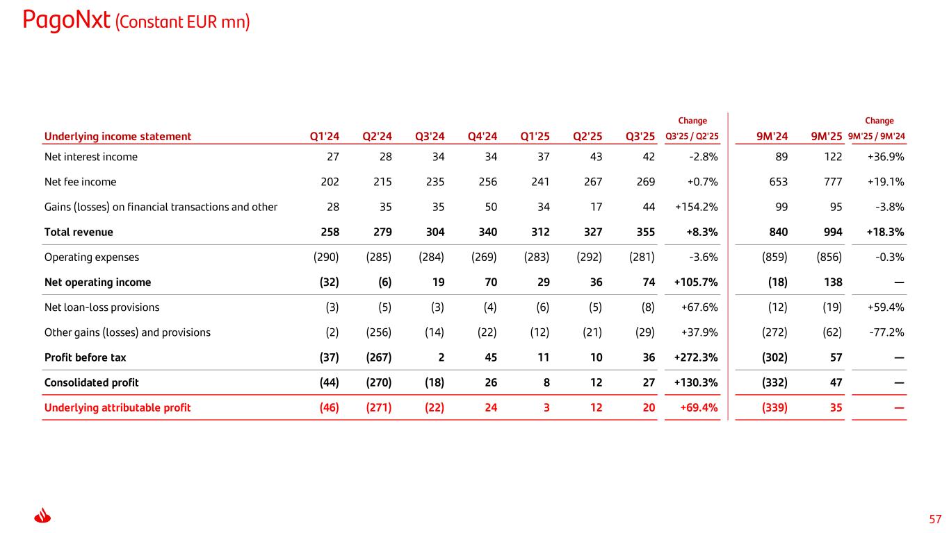 56 PagoNxt (EUR mn) Change Change Underlying income statement Q1'24 Q2'24 Q3'24 Q4'24 Q1'25 Q2'25 Q3'25 Q3'25 / Q2'25 9M'24 9M'25 9M'25 / 9M'24 Net interest income 31 31 35 35 38 42 41 -2.4% 97 122 +25.7% Net fee income 224 233 241 261 245 265 267 +0.8% 697 777 +11.4% Gains (losses) on financial transactions and other 29 36 35 50 34 17 44 +154.2% 100 95 -4.8% Total revenue 283 300 311 346 317 325 353 +8.5% 894 994 +11.2% Operating expenses (304) (297) (288) (271) (286) (290) (280) -3.5% (889) (856) -3.7% Net operating income (21) 4 23 75 31 35 73 +108.9% 5 138 — Net loan-loss provisions (4) (5) (3) (4) (6) (5) (8) +68.0% (13) (19) +50.1% Other gains (losses) and provisions (2) (256) (15) (23) (12) (21) (29) +38.3% (274) (62) -77.3% Profit before tax (27) (258) 4 48 13 9 35 +298.9% (281) 57 — Consolidated profit (37) (265) (17) 28 9 11 27 +135.8% (318) 47 — Underlying attributable profit (39) (265) (21) 26 4 11 19 +73.1% (326) 35 —