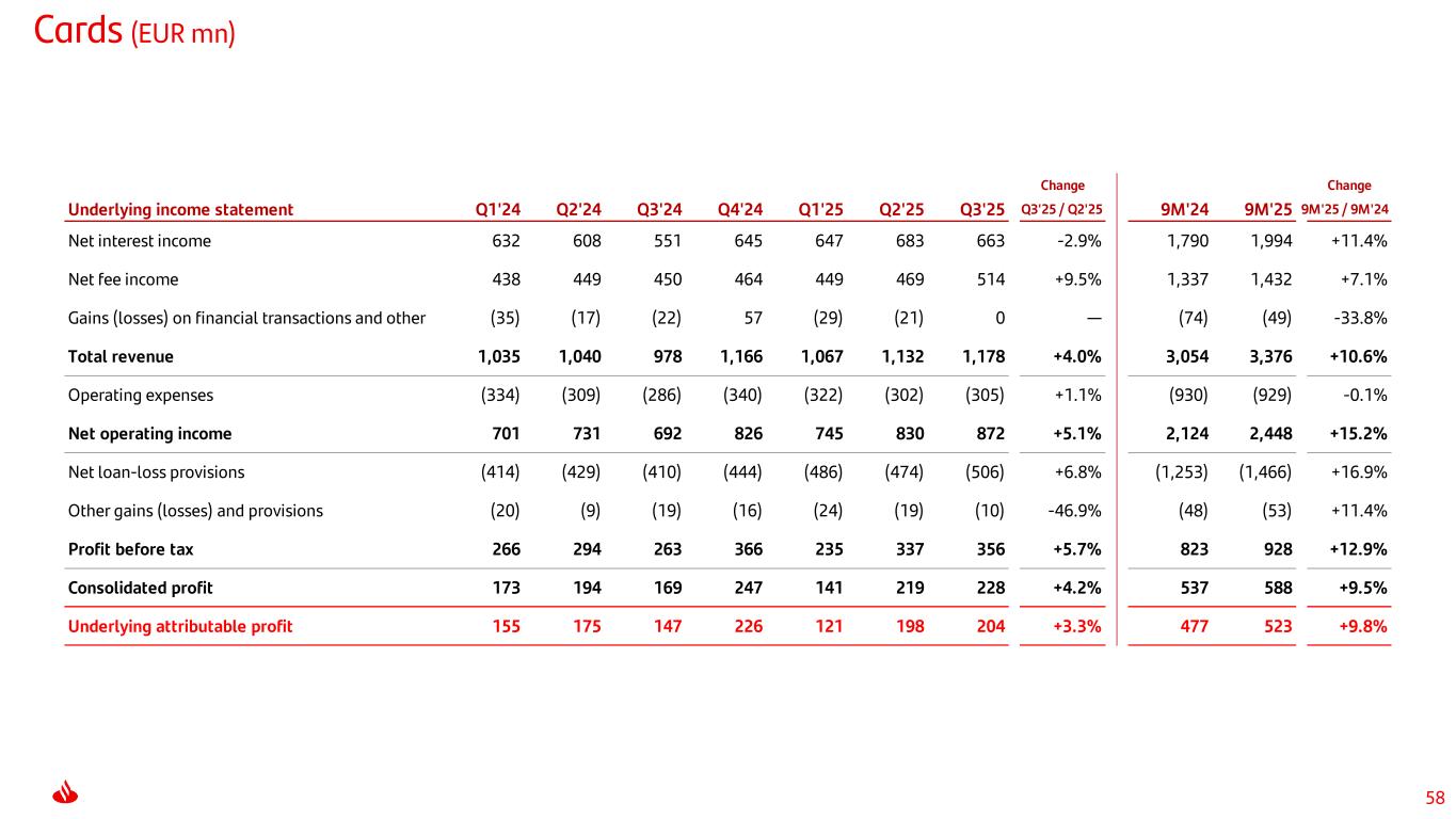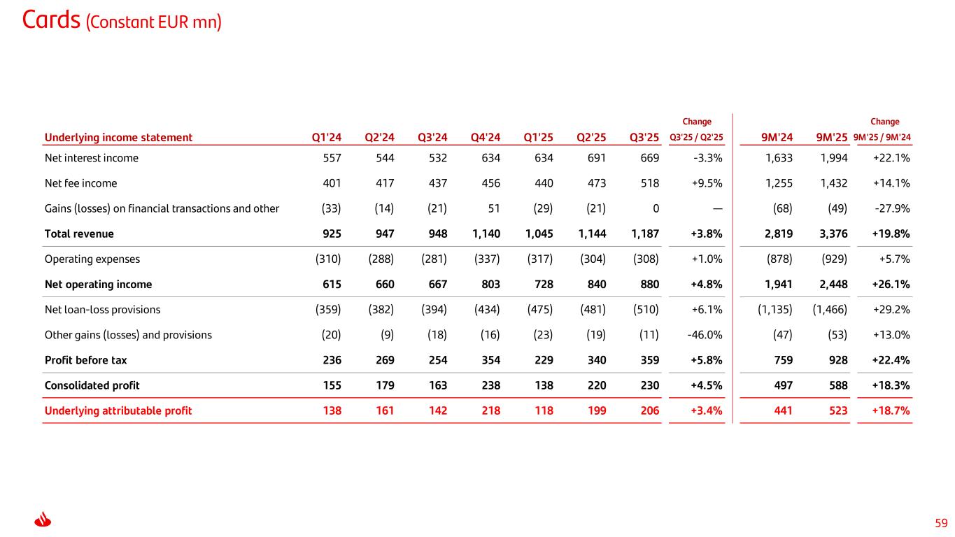 58 Cards (EUR mn) Change Change Underlying income statement Q1'24 Q2'24 Q3'24 Q4'24 Q1'25 Q2'25 Q3'25 Q3'25 / Q2'25 9M'24 9M'25 9M'25 / 9M'24 Net interest income 632 608 551 645 647 683 663 -2.9% 1,790 1,994 +11.4% Net fee income 438 449 450 464 449 469 514 +9.5% 1,337 1,432 +7.1% Gains (losses) on financial transactions and other (35) (17) (22) 57 (29) (21) 0 — (74) (49) -33.8% Total revenue 1,035 1,040 978 1,166 1,067 1,132 1,178 +4.0% 3,054 3,376 +10.6% Operating expenses (334) (309) (286) (340) (322) (302) (305) +1.1% (930) (929) -0.1% Net operating income 701 731 692 826 745 830 872 +5.1% 2,124 2,448 +15.2% Net loan-loss provisions (414) (429) (410) (444) (486) (474) (506) +6.8% (1,253) (1,466) +16.9% Other gains (losses) and provisions (20) (9) (19) (16) (24) (19) (10) -46.9% (48) (53) +11.4% Profit before tax 266 294 263 366 235 337 356 +5.7% 823 928 +12.9% Consolidated profit 173 194 169 247 141 219 228 +4.2% 537 588 +9.5% Underlying attributable profit 155 175 147 226 121 198 204 +3.3% 477 523 +9.8%