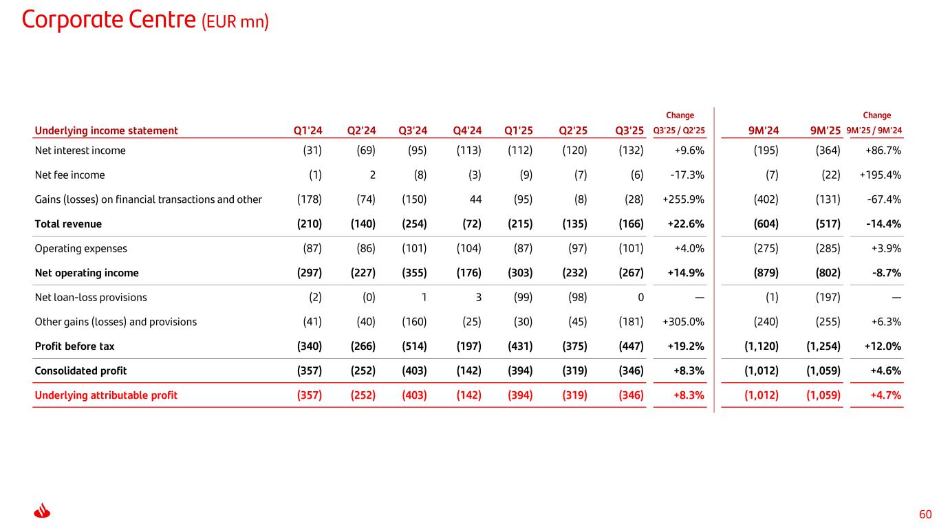 60 Corporate Centre (EUR mn) Change Change Underlying income statement Q1'24 Q2'24 Q3'24 Q4'24 Q1'25 Q2'25 Q3'25 Q3'25 / Q2'25 9M'24 9M'25 9M'25 / 9M'24 Net interest income (31) (69) (95) (113) (112) (120) (132) +9.6% (195) (364) +86.7% Net fee income (1) 2 (8) (3) (9) (7) (6) -17.3% (7) (22) +195.4% Gains (losses) on financial transactions and other (178) (74) (150) 44 (95) (8) (28) +255.9% (402) (131) -67.4% Total revenue (210) (140) (254) (72) (215) (135) (166) +22.6% (604) (517) -14.4% Operating expenses (87) (86) (101) (104) (87) (97) (101) +4.0% (275) (285) +3.9% Net operating income (297) (227) (355) (176) (303) (232) (267) +14.9% (879) (802) -8.7% Net loan-loss provisions (2) (0) 1 3 (99) (98) 0 — (1) (197) — Other gains (losses) and provisions (41) (40) (160) (25) (30) (45) (181) +305.0% (240) (255) +6.3% Profit before tax (340) (266) (514) (197) (431) (375) (447) +19.2% (1,120) (1,254) +12.0% Consolidated profit (357) (252) (403) (142) (394) (319) (346) +8.3% (1,012) (1,059) +4.6% Underlying attributable profit (357) (252) (403) (142) (394) (319) (346) +8.3% (1,012) (1,059) +4.7%