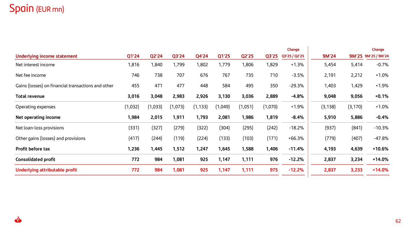62 Spain (EUR mn) Change Change Underlying income statement Q1'24 Q2'24 Q3'24 Q4'24 Q1'25 Q2'25 Q3'25 Q3'25 / Q2'25 9M'24 9M'25 9M'25 / 9M'24 Net interest income 1,816 1,840 1,799 1,802 1,779 1,806 1,829 +1.3% 5,454 5,414 -0.7% Net fee income 746 738 707 676 767 735 710 -3.5% 2,191 2,212 +1.0% Gains (losses) on financial transactions and other 455 471 477 448 584 495 350 -29.3% 1,403 1,429 +1.9% Total revenue 3,016 3,048 2,983 2,926 3,130 3,036 2,889 -4.8% 9,048 9,056 +0.1% Operating expenses (1,032) (1,033) (1,073) (1,133) (1,049) (1,051) (1,070) +1.9% (3,138) (3,170) +1.0% Net operating income 1,984 2,015 1,911 1,793 2,081 1,986 1,819 -8.4% 5,910 5,886 -0.4% Net loan-loss provisions (331) (327) (279) (322) (304) (295) (242) -18.2% (937) (841) -10.3% Other gains (losses) and provisions (417) (244) (119) (224) (133) (103) (171) +66.3% (779) (407) -47.8% Profit before tax 1,236 1,445 1,512 1,247 1,645 1,588 1,406 -11.4% 4,193 4,639 +10.6% Consolidated profit 772 984 1,081 925 1,147 1,111 976 -12.2% 2,837 3,234 +14.0% Underlying attributable profit 772 984 1,081 925 1,147 1,111 975 -12.2% 2,837 3,233 +14.0%