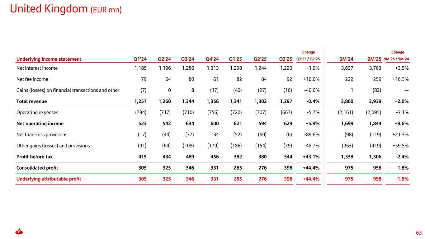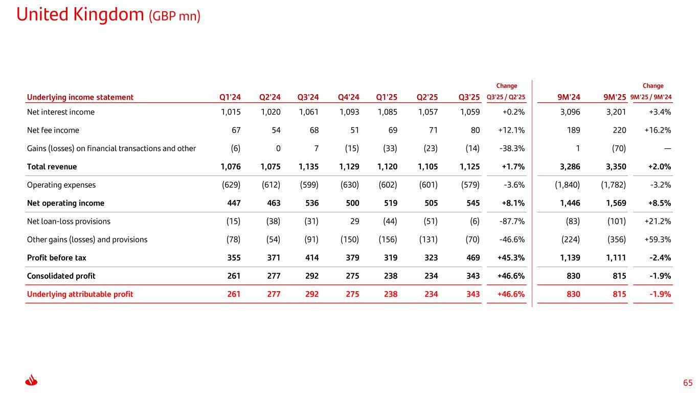 64 United Kingdom (Constant EUR mn) Change Change Underlying income statement Q1'24 Q2'24 Q3'24 Q4'24 Q1'25 Q2'25 Q3'25 Q3'25 / Q2'25 9M'24 9M'25 9M'25 / 9M'24 Net interest income 1,193 1,200 1,247 1,285 1,276 1,243 1,245 +0.2% 3,640 3,763 +3.4% Net fee income 79 64 80 60 81 84 94 +12.1% 222 259 +16.2% Gains (losses) on financial transactions and other (7) 0 8 (17) (39) (27) (16) -38.3% 1 (82) — Total revenue 1,265 1,263 1,335 1,328 1,317 1,300 1,322 +1.7% 3,863 3,939 +2.0% Operating expenses (739) (719) (705) (740) (707) (706) (681) -3.6% (2,163) (2,095) -3.2% Net operating income 526 544 630 588 610 593 641 +8.1% 1,700 1,844 +8.5% Net loan-loss provisions (17) (44) (36) 35 (52) (60) (7) -87.7% (98) (119) +21.2% Other gains (losses) and provisions (91) (64) (107) (176) (183) (154) (82) -46.6% (263) (419) +59.3% Profit before tax 417 436 486 446 375 380 552 +45.3% 1,339 1,306 -2.4% Consolidated profit 307 326 343 323 280 275 403 +46.6% 976 958 -1.9% Underlying attributable profit 307 326 343 323 280 275 403 +46.6% 976 958 -1.9%