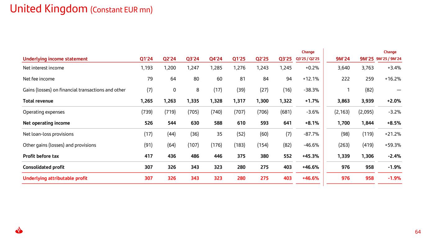63 United Kingdom (EUR mn) Change Change Underlying income statement Q1'24 Q2'24 Q3'24 Q4'24 Q1'25 Q2'25 Q3'25 Q3'25 / Q2'25 9M'24 9M'25 9M'25 / 9M'24 Net interest income 1,185 1,196 1,256 1,313 1,298 1,244 1,220 -1.9% 3,637 3,763 +3.5% Net fee income 79 64 80 61 82 84 92 +10.0% 222 259 +16.3% Gains (losses) on financial transactions and other (7) 0 8 (17) (40) (27) (16) -40.6% 1 (82) — Total revenue 1,257 1,260 1,344 1,356 1,341 1,302 1,297 -0.4% 3,860 3,939 +2.0% Operating expenses (734) (717) (710) (756) (720) (707) (667) -5.7% (2,161) (2,095) -3.1% Net operating income 523 542 634 600 621 594 629 +5.9% 1,699 1,844 +8.6% Net loan-loss provisions (17) (44) (37) 34 (52) (60) (6) -89.6% (98) (119) +21.3% Other gains (losses) and provisions (91) (64) (108) (179) (186) (154) (79) -48.7% (263) (419) +59.5% Profit before tax 415 434 489 456 382 380 544 +43.1% 1,338 1,306 -2.4% Consolidated profit 305 325 346 331 285 276 398 +44.4% 975 958 -1.8% Underlying attributable profit 305 325 346 331 285 276 398 +44.4% 975 958 -1.8%