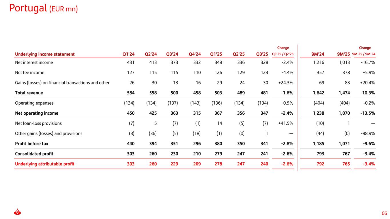 66 Portugal (EUR mn) Change Change Underlying income statement Q1'24 Q2'24 Q3'24 Q4'24 Q1'25 Q2'25 Q3'25 Q3'25 / Q2'25 9M'24 9M'25 9M'25 / 9M'24 Net interest income 431 413 373 332 348 336 328 -2.4% 1,216 1,013 -16.7% Net fee income 127 115 115 110 126 129 123 -4.4% 357 378 +5.9% Gains (losses) on financial transactions and other 26 30 13 16 29 24 30 +24.3% 69 83 +20.4% Total revenue 584 558 500 458 503 489 481 -1.6% 1,642 1,474 -10.3% Operating expenses (134) (134) (137) (143) (136) (134) (134) +0.5% (404) (404) -0.2% Net operating income 450 425 363 315 367 356 347 -2.4% 1,238 1,070 -13.5% Net loan-loss provisions (7) 5 (7) (1) 14 (5) (7) +41.5% (10) 1 — Other gains (losses) and provisions (3) (36) (5) (18) (1) (0) 1 — (44) (0) -98.9% Profit before tax 440 394 351 296 380 350 341 -2.8% 1,185 1,071 -9.6% Consolidated profit 303 260 230 210 279 247 241 -2.6% 793 767 -3.4% Underlying attributable profit 303 260 229 209 278 247 240 -2.6% 792 765 -3.4%