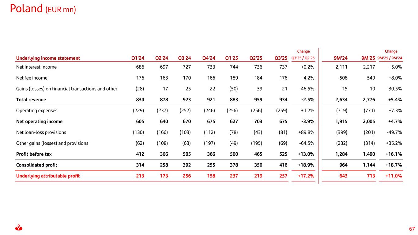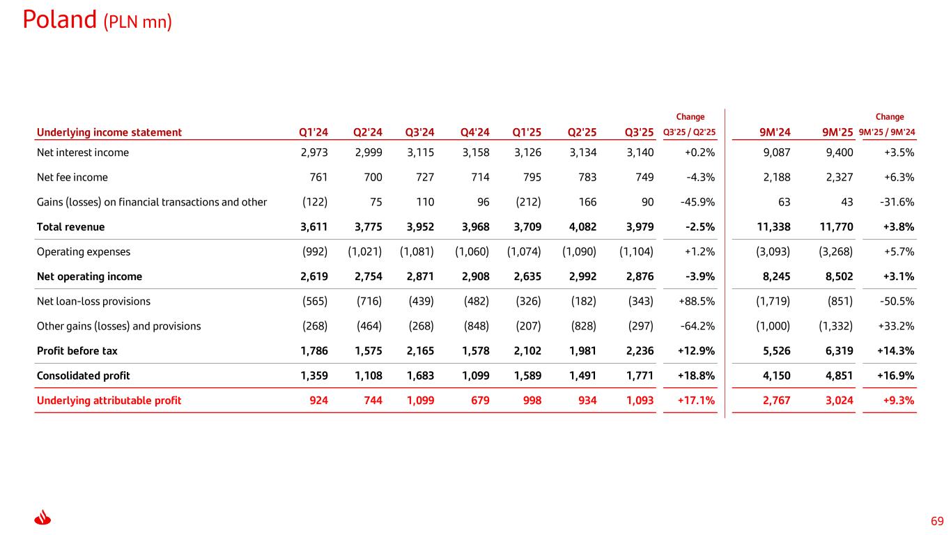 68 Poland (Constant EUR mn) Change Change Underlying income statement Q1'24 Q2'24 Q3'24 Q4'24 Q1'25 Q2'25 Q3'25 Q3'25 / Q2'25 9M'24 9M'25 9M'25 / 9M'24 Net interest income 701 707 735 745 737 739 741 +0.2% 2,143 2,217 +3.5% Net fee income 179 165 171 168 188 185 177 -4.3% 516 549 +6.3% Gains (losses) on financial transactions and other (29) 18 26 23 (50) 39 21 -45.9% 15 10 -31.6% Total revenue 852 890 932 936 875 963 938 -2.5% 2,674 2,776 +3.8% Operating expenses (234) (241) (255) (250) (253) (257) (260) +1.2% (730) (771) +5.7% Net operating income 618 650 677 686 621 706 678 -3.9% 1,945 2,005 +3.1% Net loan-loss provisions (133) (169) (103) (114) (77) (43) (81) +88.5% (405) (201) -50.5% Other gains (losses) and provisions (63) (109) (63) (200) (49) (195) (70) -64.2% (236) (314) +33.2% Profit before tax 421 371 511 372 496 467 527 +12.9% 1,303 1,490 +14.3% Consolidated profit 320 261 397 259 375 352 418 +18.8% 979 1,144 +16.9% Underlying attributable profit 218 175 259 160 235 220 258 +17.1% 653 713 +9.3%