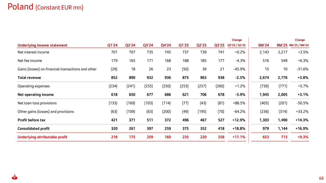 67 Poland (EUR mn) Change Change Underlying income statement Q1'24 Q2'24 Q3'24 Q4'24 Q1'25 Q2'25 Q3'25 Q3'25 / Q2'25 9M'24 9M'25 9M'25 / 9M'24 Net interest income 686 697 727 733 744 736 737 +0.2% 2,111 2,217 +5.0% Net fee income 176 163 170 166 189 184 176 -4.2% 508 549 +8.0% Gains (losses) on financial transactions and other (28) 17 25 22 (50) 39 21 -46.5% 15 10 -30.5% Total revenue 834 878 923 921 883 959 934 -2.5% 2,634 2,776 +5.4% Operating expenses (229) (237) (252) (246) (256) (256) (259) +1.2% (719) (771) +7.3% Net operating income 605 640 670 675 627 703 675 -3.9% 1,915 2,005 +4.7% Net loan-loss provisions (130) (166) (103) (112) (78) (43) (81) +89.8% (399) (201) -49.7% Other gains (losses) and provisions (62) (108) (63) (197) (49) (195) (69) -64.5% (232) (314) +35.2% Profit before tax 412 366 505 366 500 465 525 +13.0% 1,284 1,490 +16.1% Consolidated profit 314 258 392 255 378 350 416 +18.9% 964 1,144 +18.7% Underlying attributable profit 213 173 256 158 237 219 257 +17.2% 643 713 +11.0%