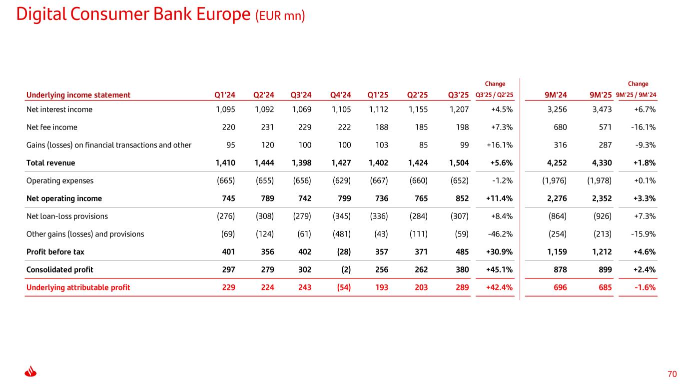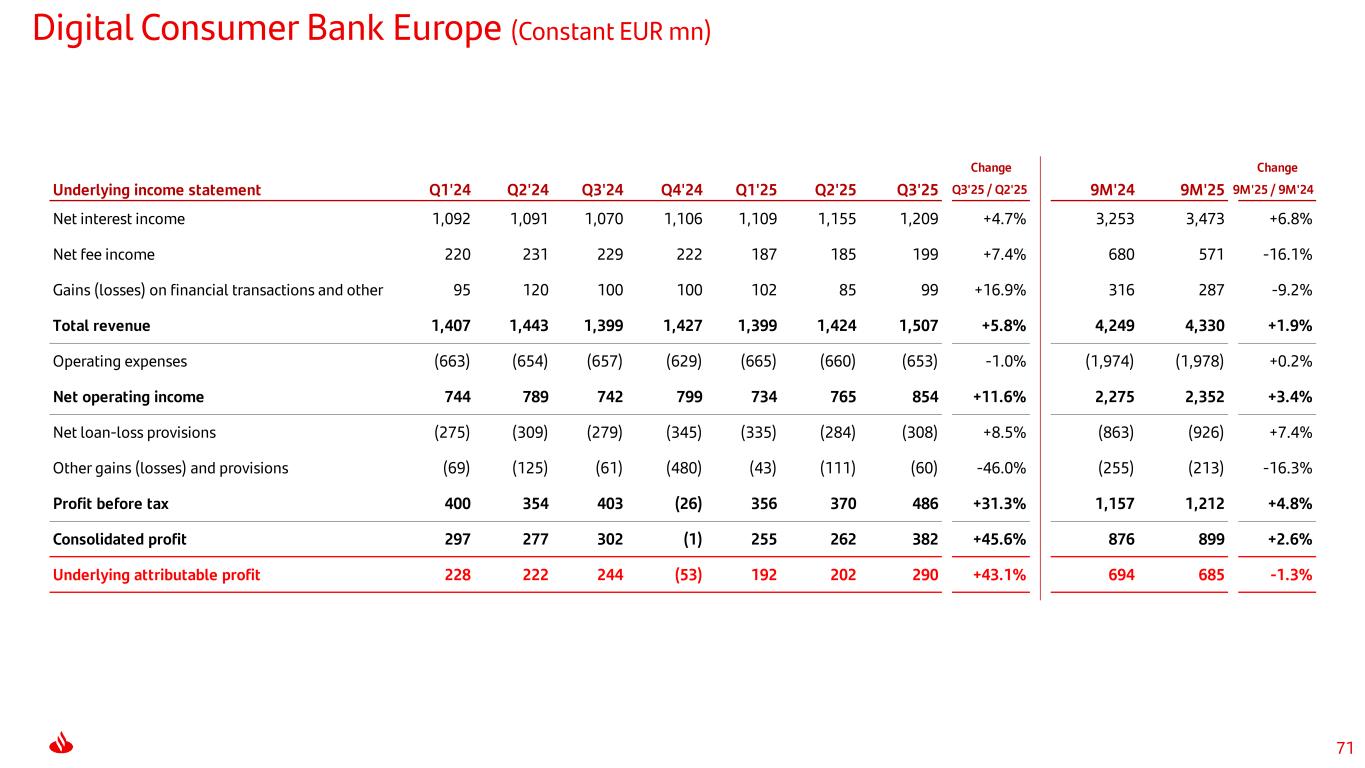 70 Digital Consumer Bank Europe (EUR mn) Change Change Underlying income statement Q1'24 Q2'24 Q3'24 Q4'24 Q1'25 Q2'25 Q3'25 Q3'25 / Q2'25 9M'24 9M'25 9M'25 / 9M'24 Net interest income 1,095 1,092 1,069 1,105 1,112 1,155 1,207 +4.5% 3,256 3,473 +6.7% Net fee income 220 231 229 222 188 185 198 +7.3% 680 571 -16.1% Gains (losses) on financial transactions and other 95 120 100 100 103 85 99 +16.1% 316 287 -9.3% Total revenue 1,410 1,444 1,398 1,427 1,402 1,424 1,504 +5.6% 4,252 4,330 +1.8% Operating expenses (665) (655) (656) (629) (667) (660) (652) -1.2% (1,976) (1,978) +0.1% Net operating income 745 789 742 799 736 765 852 +11.4% 2,276 2,352 +3.3% Net loan-loss provisions (276) (308) (279) (345) (336) (284) (307) +8.4% (864) (926) +7.3% Other gains (losses) and provisions (69) (124) (61) (481) (43) (111) (59) -46.2% (254) (213) -15.9% Profit before tax 401 356 402 (28) 357 371 485 +30.9% 1,159 1,212 +4.6% Consolidated profit 297 279 302 (2) 256 262 380 +45.1% 878 899 +2.4% Underlying attributable profit 229 224 243 (54) 193 203 289 +42.4% 696 685 -1.6%