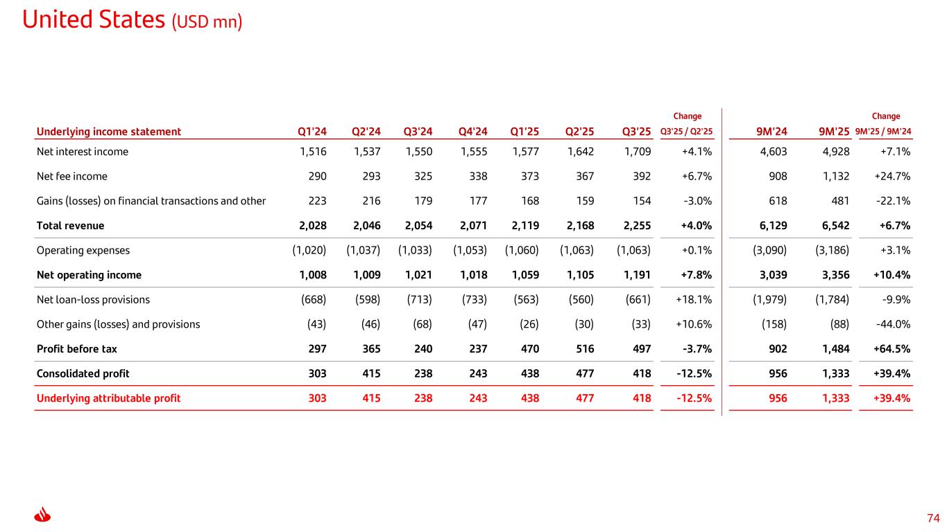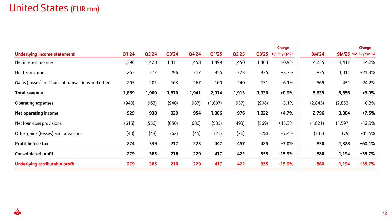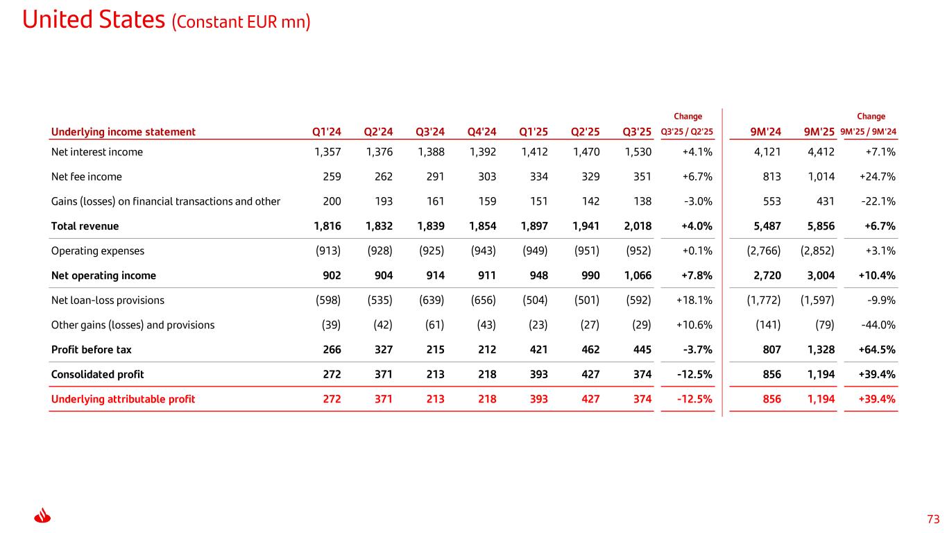 72 United States (EUR mn) Change Change Underlying income statement Q1'24 Q2'24 Q3'24 Q4'24 Q1'25 Q2'25 Q3'25 Q3'25 / Q2'25 9M'24 9M'25 9M'25 / 9M'24 Net interest income 1,396 1,428 1,411 1,458 1,499 1,450 1,463 +0.9% 4,235 4,412 +4.2% Net fee income 267 272 296 317 355 323 335 +3.7% 835 1,014 +21.4% Gains (losses) on financial transactions and other 205 201 163 167 160 140 131 -6.1% 569 431 -24.2% Total revenue 1,869 1,900 1,870 1,941 2,014 1,913 1,930 +0.9% 5,639 5,856 +3.9% Operating expenses (940) (963) (940) (987) (1,007) (937) (908) -3.1% (2,843) (2,852) +0.3% Net operating income 929 938 929 954 1,006 976 1,022 +4.7% 2,796 3,004 +7.5% Net loan-loss provisions (615) (556) (650) (686) (535) (493) (569) +15.3% (1,821) (1,597) -12.3% Other gains (losses) and provisions (40) (43) (62) (45) (25) (26) (28) +7.4% (145) (79) -45.5% Profit before tax 274 339 217 223 447 457 425 -7.0% 830 1,328 +60.1% Consolidated profit 279 385 216 229 417 422 355 -15.9% 880 1,194 +35.7% Underlying attributable profit 279 385 216 229 417 422 355 -15.9% 880 1,194 +35.7%