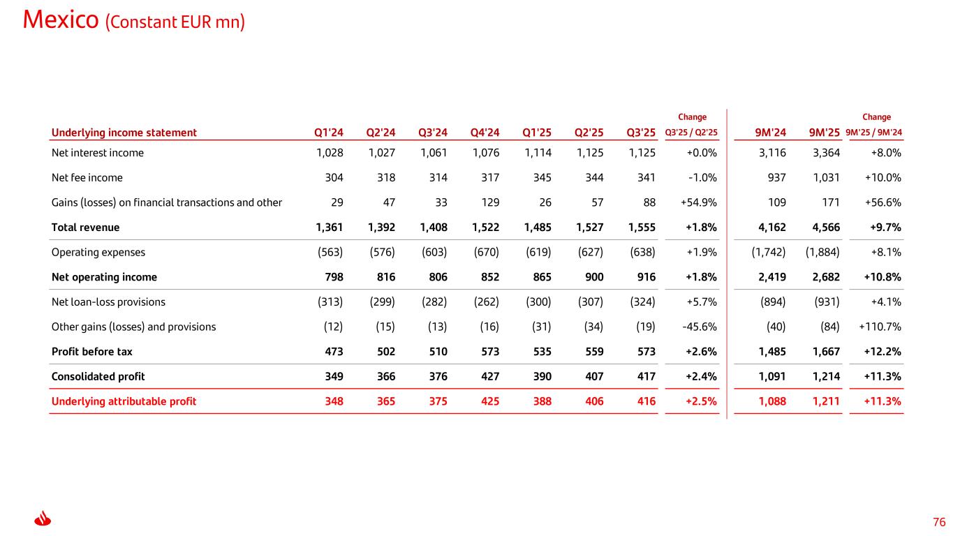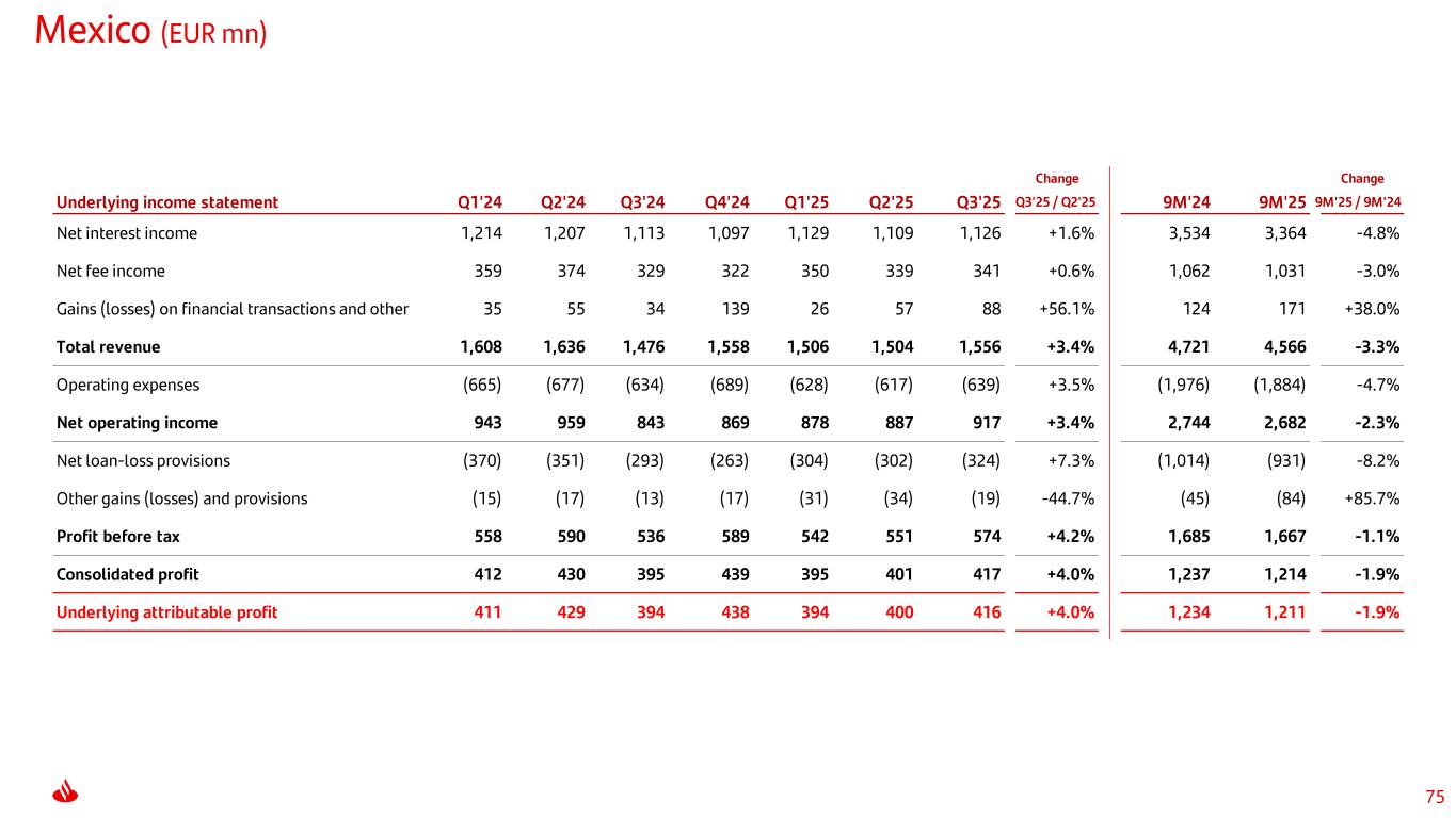 75 Mexico (EUR mn) Change Change Underlying income statement Q1'24 Q2'24 Q3'24 Q4'24 Q1'25 Q2'25 Q3'25 Q3'25 / Q2'25 9M'24 9M'25 9M'25 / 9M'24 Net interest income 1,214 1,207 1,113 1,097 1,129 1,109 1,126 +1.6% 3,534 3,364 -4.8% Net fee income 359 374 329 322 350 339 341 +0.6% 1,062 1,031 -3.0% Gains (losses) on financial transactions and other 35 55 34 139 26 57 88 +56.1% 124 171 +38.0% Total revenue 1,608 1,636 1,476 1,558 1,506 1,504 1,556 +3.4% 4,721 4,566 -3.3% Operating expenses (665) (677) (634) (689) (628) (617) (639) +3.5% (1,976) (1,884) -4.7% Net operating income 943 959 843 869 878 887 917 +3.4% 2,744 2,682 -2.3% Net loan-loss provisions (370) (351) (293) (263) (304) (302) (324) +7.3% (1,014) (931) -8.2% Other gains (losses) and provisions (15) (17) (13) (17) (31) (34) (19) -44.7% (45) (84) +85.7% Profit before tax 558 590 536 589 542 551 574 +4.2% 1,685 1,667 -1.1% Consolidated profit 412 430 395 439 395 401 417 +4.0% 1,237 1,214 -1.9% Underlying attributable profit 411 429 394 438 394 400 416 +4.0% 1,234 1,211 -1.9%