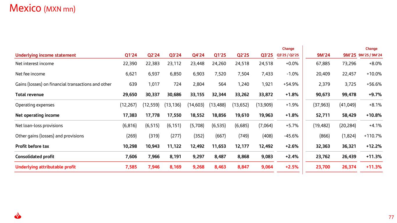 76 Mexico (Constant EUR mn) Change Change Underlying income statement Q1'24 Q2'24 Q3'24 Q4'24 Q1'25 Q2'25 Q3'25 Q3'25 / Q2'25 9M'24 9M'25 9M'25 / 9M'24 Net interest income 1,028 1,027 1,061 1,076 1,114 1,125 1,125 +0.0% 3,116 3,364 +8.0% Net fee income 304 318 314 317 345 344 341 -1.0% 937 1,031 +10.0% Gains (losses) on financial transactions and other 29 47 33 129 26 57 88 +54.9% 109 171 +56.6% Total revenue 1,361 1,392 1,408 1,522 1,485 1,527 1,555 +1.8% 4,162 4,566 +9.7% Operating expenses (563) (576) (603) (670) (619) (627) (638) +1.9% (1,742) (1,884) +8.1% Net operating income 798 816 806 852 865 900 916 +1.8% 2,419 2,682 +10.8% Net loan-loss provisions (313) (299) (282) (262) (300) (307) (324) +5.7% (894) (931) +4.1% Other gains (losses) and provisions (12) (15) (13) (16) (31) (34) (19) -45.6% (40) (84) +110.7% Profit before tax 473 502 510 573 535 559 573 +2.6% 1,485 1,667 +12.2% Consolidated profit 349 366 376 427 390 407 417 +2.4% 1,091 1,214 +11.3% Underlying attributable profit 348 365 375 425 388 406 416 +2.5% 1,088 1,211 +11.3%
