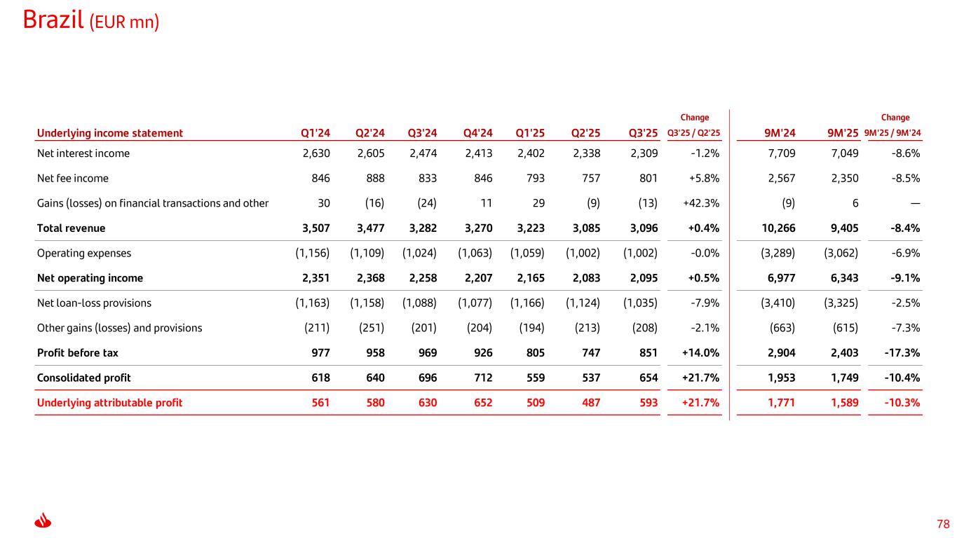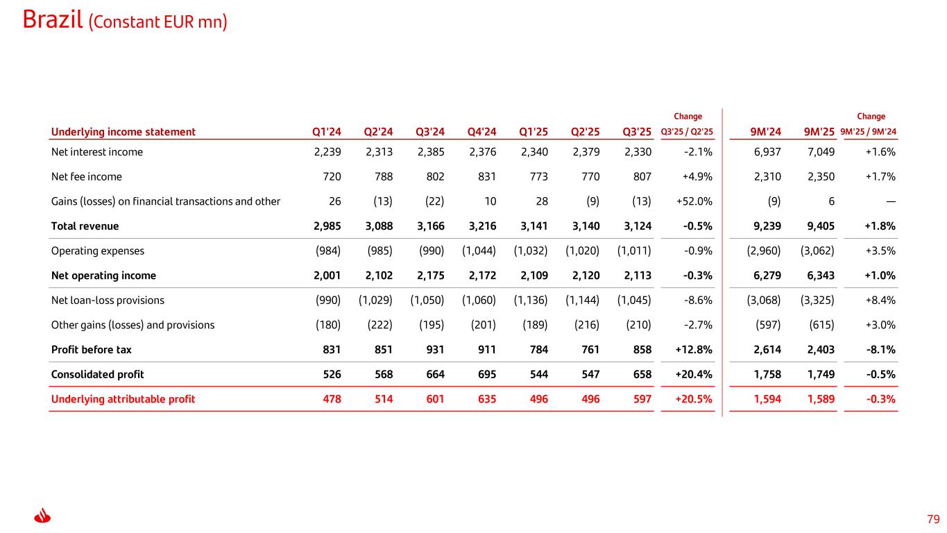 78 Brazil (EUR mn) Change Change Underlying income statement Q1'24 Q2'24 Q3'24 Q4'24 Q1'25 Q2'25 Q3'25 Q3'25 / Q2'25 9M'24 9M'25 9M'25 / 9M'24 Net interest income 2,630 2,605 2,474 2,413 2,402 2,338 2,309 -1.2% 7,709 7,049 -8.6% Net fee income 846 888 833 846 793 757 801 +5.8% 2,567 2,350 -8.5% Gains (losses) on financial transactions and other 30 (16) (24) 11 29 (9) (13) +42.3% (9) 6 — Total revenue 3,507 3,477 3,282 3,270 3,223 3,085 3,096 +0.4% 10,266 9,405 -8.4% Operating expenses (1,156) (1,109) (1,024) (1,063) (1,059) (1,002) (1,002) -0.0% (3,289) (3,062) -6.9% Net operating income 2,351 2,368 2,258 2,207 2,165 2,083 2,095 +0.5% 6,977 6,343 -9.1% Net loan-loss provisions (1,163) (1,158) (1,088) (1,077) (1,166) (1,124) (1,035) -7.9% (3,410) (3,325) -2.5% Other gains (losses) and provisions (211) (251) (201) (204) (194) (213) (208) -2.1% (663) (615) -7.3% Profit before tax 977 958 969 926 805 747 851 +14.0% 2,904 2,403 -17.3% Consolidated profit 618 640 696 712 559 537 654 +21.7% 1,953 1,749 -10.4% Underlying attributable profit 561 580 630 652 509 487 593 +21.7% 1,771 1,589 -10.3%
