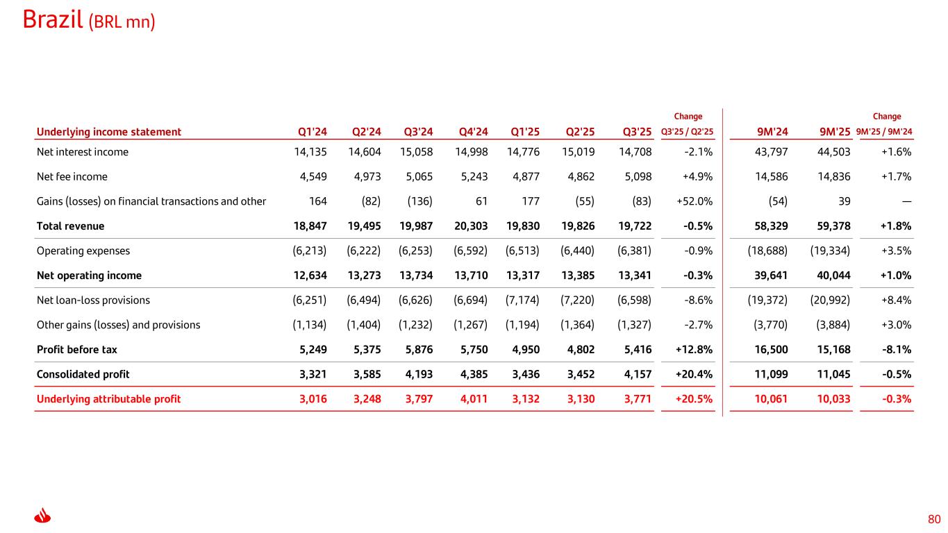 79 Brazil (Constant EUR mn) Change Change Underlying income statement Q1'24 Q2'24 Q3'24 Q4'24 Q1'25 Q2'25 Q3'25 Q3'25 / Q2'25 9M'24 9M'25 9M'25 / 9M'24 Net interest income 2,239 2,313 2,385 2,376 2,340 2,379 2,330 -2.1% 6,937 7,049 +1.6% Net fee income 720 788 802 831 773 770 807 +4.9% 2,310 2,350 +1.7% Gains (losses) on financial transactions and other 26 (13) (22) 10 28 (9) (13) +52.0% (9) 6 — Total revenue 2,985 3,088 3,166 3,216 3,141 3,140 3,124 -0.5% 9,239 9,405 +1.8% Operating expenses (984) (985) (990) (1,044) (1,032) (1,020) (1,011) -0.9% (2,960) (3,062) +3.5% Net operating income 2,001 2,102 2,175 2,172 2,109 2,120 2,113 -0.3% 6,279 6,343 +1.0% Net loan-loss provisions (990) (1,029) (1,050) (1,060) (1,136) (1,144) (1,045) -8.6% (3,068) (3,325) +8.4% Other gains (losses) and provisions (180) (222) (195) (201) (189) (216) (210) -2.7% (597) (615) +3.0% Profit before tax 831 851 931 911 784 761 858 +12.8% 2,614 2,403 -8.1% Consolidated profit 526 568 664 695 544 547 658 +20.4% 1,758 1,749 -0.5% Underlying attributable profit 478 514 601 635 496 496 597 +20.5% 1,594 1,589 -0.3%