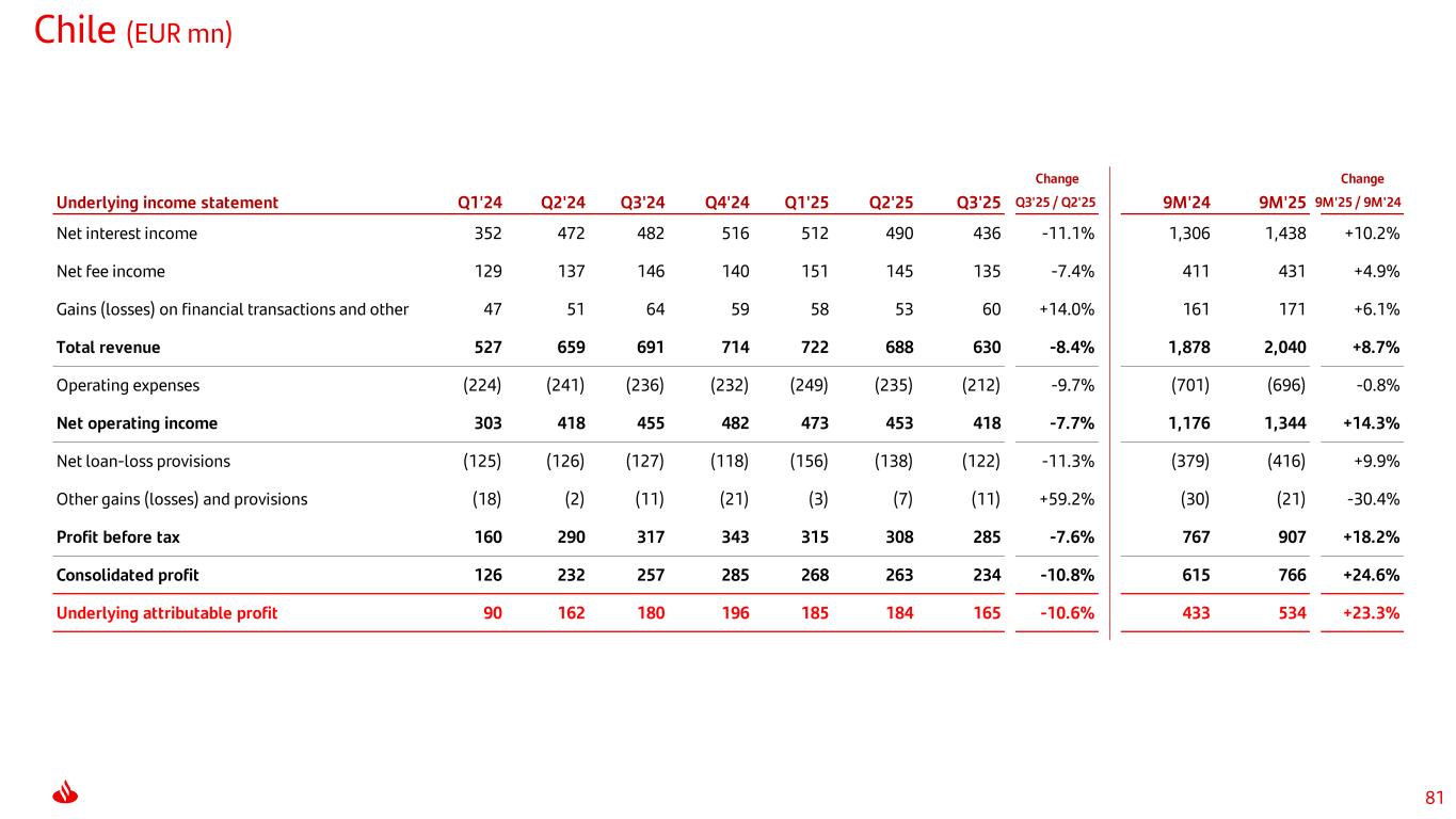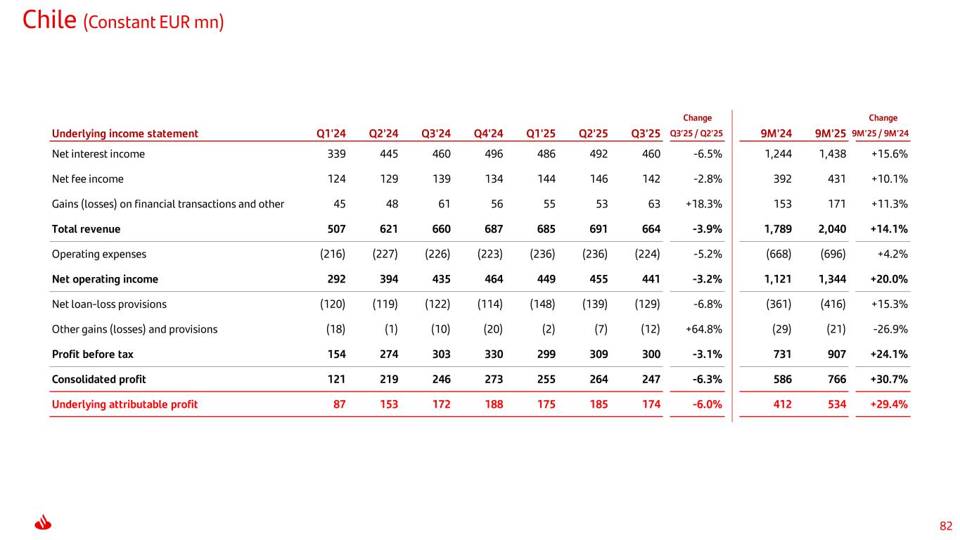 81 Chile (EUR mn) Change Change Underlying income statement Q1'24 Q2'24 Q3'24 Q4'24 Q1'25 Q2'25 Q3'25 Q3'25 / Q2'25 9M'24 9M'25 9M'25 / 9M'24 Net interest income 352 472 482 516 512 490 436 -11.1% 1,306 1,438 +10.2% Net fee income 129 137 146 140 151 145 135 -7.4% 411 431 +4.9% Gains (losses) on financial transactions and other 47 51 64 59 58 53 60 +14.0% 161 171 +6.1% Total revenue 527 659 691 714 722 688 630 -8.4% 1,878 2,040 +8.7% Operating expenses (224) (241) (236) (232) (249) (235) (212) -9.7% (701) (696) -0.8% Net operating income 303 418 455 482 473 453 418 -7.7% 1,176 1,344 +14.3% Net loan-loss provisions (125) (126) (127) (118) (156) (138) (122) -11.3% (379) (416) +9.9% Other gains (losses) and provisions (18) (2) (11) (21) (3) (7) (11) +59.2% (30) (21) -30.4% Profit before tax 160 290 317 343 315 308 285 -7.6% 767 907 +18.2% Consolidated profit 126 232 257 285 268 263 234 -10.8% 615 766 +24.6% Underlying attributable profit 90 162 180 196 185 184 165 -10.6% 433 534 +23.3%
