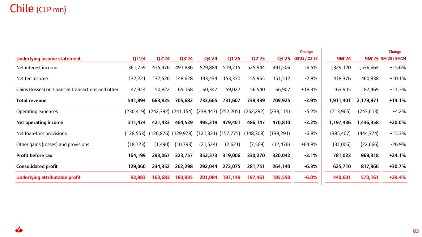83 Chile (CLP mn) Change Change Underlying income statement Q1'24 Q2'24 Q3'24 Q4'24 Q1'25 Q2'25 Q3'25 Q3'25 / Q2'25 9M'24 9M'25 9M'25 / 9M'24 Net interest income 361,759 475,476 491,886 529,884 519,215 525,944 491,506 -6.5% 1,329,120 1,536,664 +15.6% Net fee income 132,221 137,526 148,628 143,434 153,370 155,955 151,512 -2.8% 418,376 460,838 +10.1% Gains (losses) on financial transactions and other 47,914 50,822 65,168 60,347 59,022 56,540 66,907 +18.3% 163,905 182,469 +11.3% Total revenue 541,894 663,825 705,682 733,665 731,607 738,439 709,925 -3.9% 1,911,401 2,179,971 +14.1% Operating expenses (230,419) (242,392) (241,154) (238,447) (252,205) (252,292) (239,115) -5.2% (713,965) (743,613) +4.2% Net operating income 311,474 421,433 464,529 495,219 479,401 486,147 470,810 -3.2% 1,197,436 1,436,358 +20.0% Net loan-loss provisions (128,553) (126,876) (129,978) (121,321) (157,775) (148,308) (138,291) -6.8% (385,407) (444,374) +15.3% Other gains (losses) and provisions (18,723) (1,490) (10,793) (21,524) (2,621) (7,569) (12,476) +64.8% (31,006) (22,666) -26.9% Profit before tax 164,199 293,067 323,757 352,373 319,006 330,270 320,042 -3.1% 781,023 969,318 +24.1% Consolidated profit 129,060 234,352 262,298 292,044 272,075 281,751 264,140 -6.3% 625,710 817,966 +30.7% Underlying attributable profit 92,983 163,683 183,935 201,084 187,149 197,461 185,550 -6.0% 440,601 570,161 +29.4%