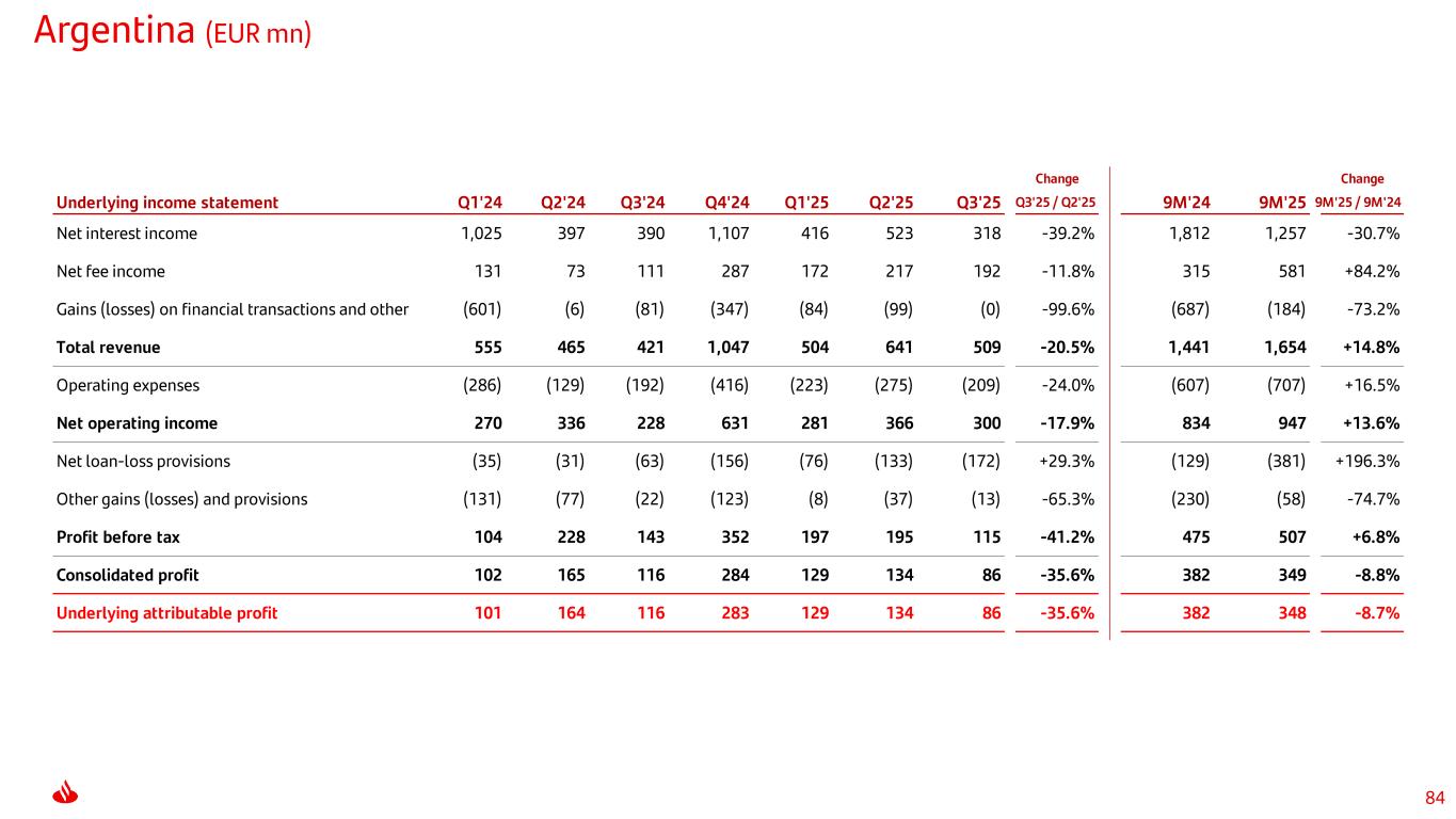 84 Argentina (EUR mn) Change Change Underlying income statement Q1'24 Q2'24 Q3'24 Q4'24 Q1'25 Q2'25 Q3'25 Q3'25 / Q2'25 9M'24 9M'25 9M'25 / 9M'24 Net interest income 1,025 397 390 1,107 416 523 318 -39.2% 1,812 1,257 -30.7% Net fee income 131 73 111 287 172 217 192 -11.8% 315 581 +84.2% Gains (losses) on financial transactions and other (601) (6) (81) (347) (84) (99) (0) -99.6% (687) (184) -73.2% Total revenue 555 465 421 1,047 504 641 509 -20.5% 1,441 1,654 +14.8% Operating expenses (286) (129) (192) (416) (223) (275) (209) -24.0% (607) (707) +16.5% Net operating income 270 336 228 631 281 366 300 -17.9% 834 947 +13.6% Net loan-loss provisions (35) (31) (63) (156) (76) (133) (172) +29.3% (129) (381) +196.3% Other gains (losses) and provisions (131) (77) (22) (123) (8) (37) (13) -65.3% (230) (58) -74.7% Profit before tax 104 228 143 352 197 195 115 -41.2% 475 507 +6.8% Consolidated profit 102 165 116 284 129 134 86 -35.6% 382 349 -8.8% Underlying attributable profit 101 164 116 283 129 134 86 -35.6% 382 348 -8.7%