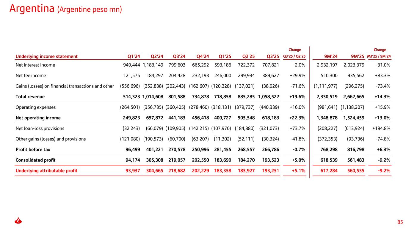 85 Argentina (Argentine peso mn) Change Change Underlying income statement Q1'24 Q2'24 Q3'24 Q4'24 Q1'25 Q2'25 Q3'25 Q3'25 / Q2'25 9M'24 9M'25 9M'25 / 9M'24 Net interest income 949,444 1,183,149 799,603 665,292 593,186 722,372 707,821 -2.0% 2,932,197 2,023,379 -31.0% Net fee income 121,575 184,297 204,428 232,193 246,000 299,934 389,627 +29.9% 510,300 935,562 +83.3% Gains (losses) on financial transactions and other (556,696) (352,838) (202,443) (162,607) (120,328) (137,021) (38,926) -71.6% (1,111,977) (296,275) -73.4% Total revenue 514,323 1,014,608 801,588 734,878 718,858 885,285 1,058,522 +19.6% 2,330,519 2,662,665 +14.3% Operating expenses (264,501) (356,735) (360,405) (278,460) (318,131) (379,737) (440,339) +16.0% (981,641) (1,138,207) +15.9% Net operating income 249,823 657,872 441,183 456,418 400,727 505,548 618,183 +22.3% 1,348,878 1,524,459 +13.0% Net loan-loss provisions (32,243) (66,079) (109,905) (142,215) (107,970) (184,880) (321,073) +73.7% (208,227) (613,924) +194.8% Other gains (losses) and provisions (121,080) (190,573) (60,700) (63,207) (11,302) (52,111) (30,324) -41.8% (372,353) (93,736) -74.8% Profit before tax 96,499 401,221 270,578 250,996 281,455 268,557 266,786 -0.7% 768,298 816,798 +6.3% Consolidated profit 94,174 305,308 219,057 202,550 183,690 184,270 193,523 +5.0% 618,539 561,483 -9.2% Underlying attributable profit 93,937 304,665 218,682 202,229 183,358 183,927 193,251 +5.1% 617,284 560,535 -9.2%