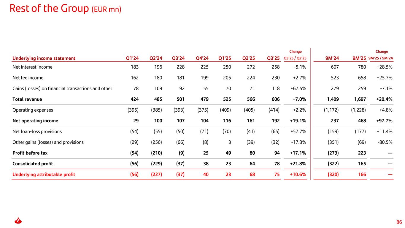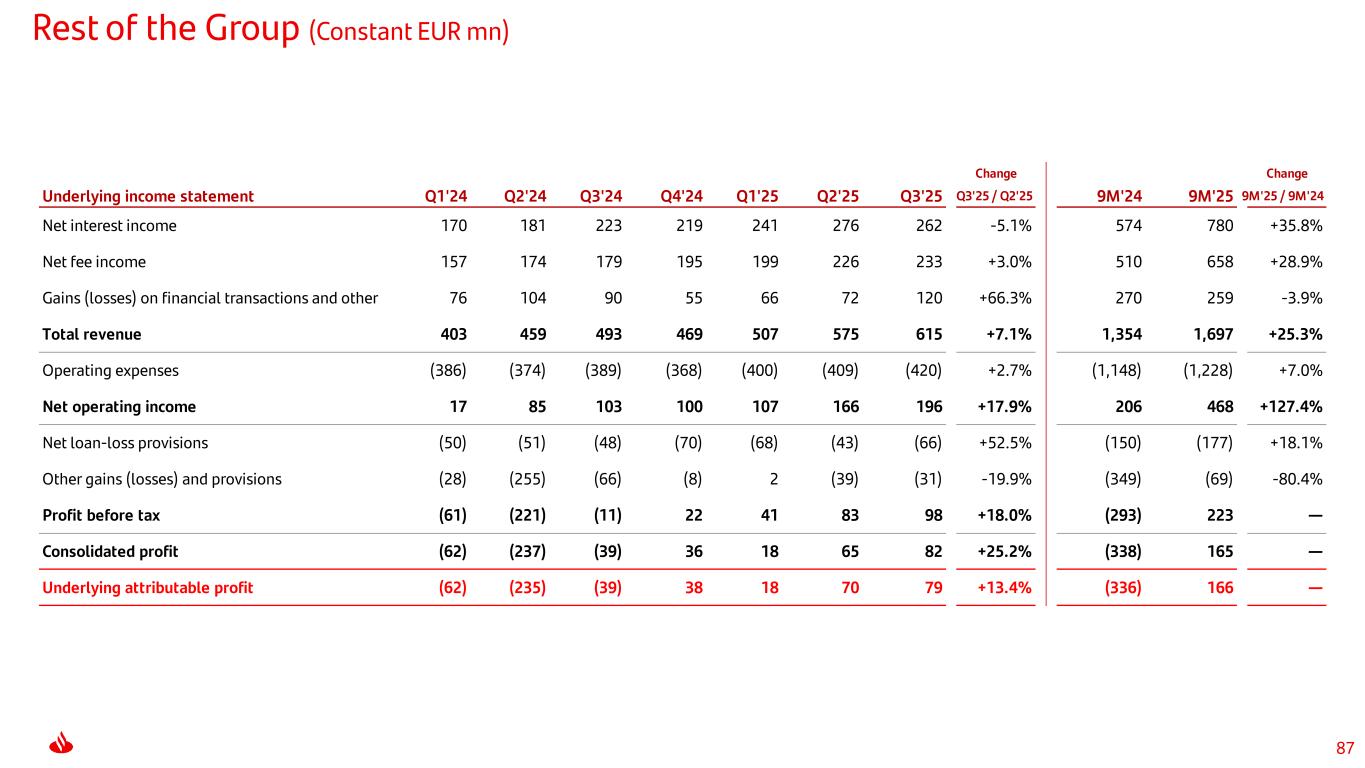 86 Rest of the Group (EUR mn) Change Change Underlying income statement Q1'24 Q2'24 Q3'24 Q4'24 Q1'25 Q2'25 Q3'25 Q3'25 / Q2'25 9M'24 9M'25 9M'25 / 9M'24 Net interest income 183 196 228 225 250 272 258 -5.1% 607 780 +28.5% Net fee income 162 180 181 199 205 224 230 +2.7% 523 658 +25.7% Gains (losses) on financial transactions and other 78 109 92 55 70 71 118 +67.5% 279 259 -7.1% Total revenue 424 485 501 479 525 566 606 +7.0% 1,409 1,697 +20.4% Operating expenses (395) (385) (393) (375) (409) (405) (414) +2.2% (1,172) (1,228) +4.8% Net operating income 29 100 107 104 116 161 192 +19.1% 237 468 +97.7% Net loan-loss provisions (54) (55) (50) (71) (70) (41) (65) +57.7% (159) (177) +11.4% Other gains (losses) and provisions (29) (256) (66) (8) 3 (39) (32) -17.3% (351) (69) -80.5% Profit before tax (54) (210) (9) 25 49 80 94 +17.1% (273) 223 — Consolidated profit (56) (229) (37) 38 23 64 78 +21.8% (322) 165 — Underlying attributable profit (56) (227) (37) 40 23 68 75 +10.6% (320) 166 —