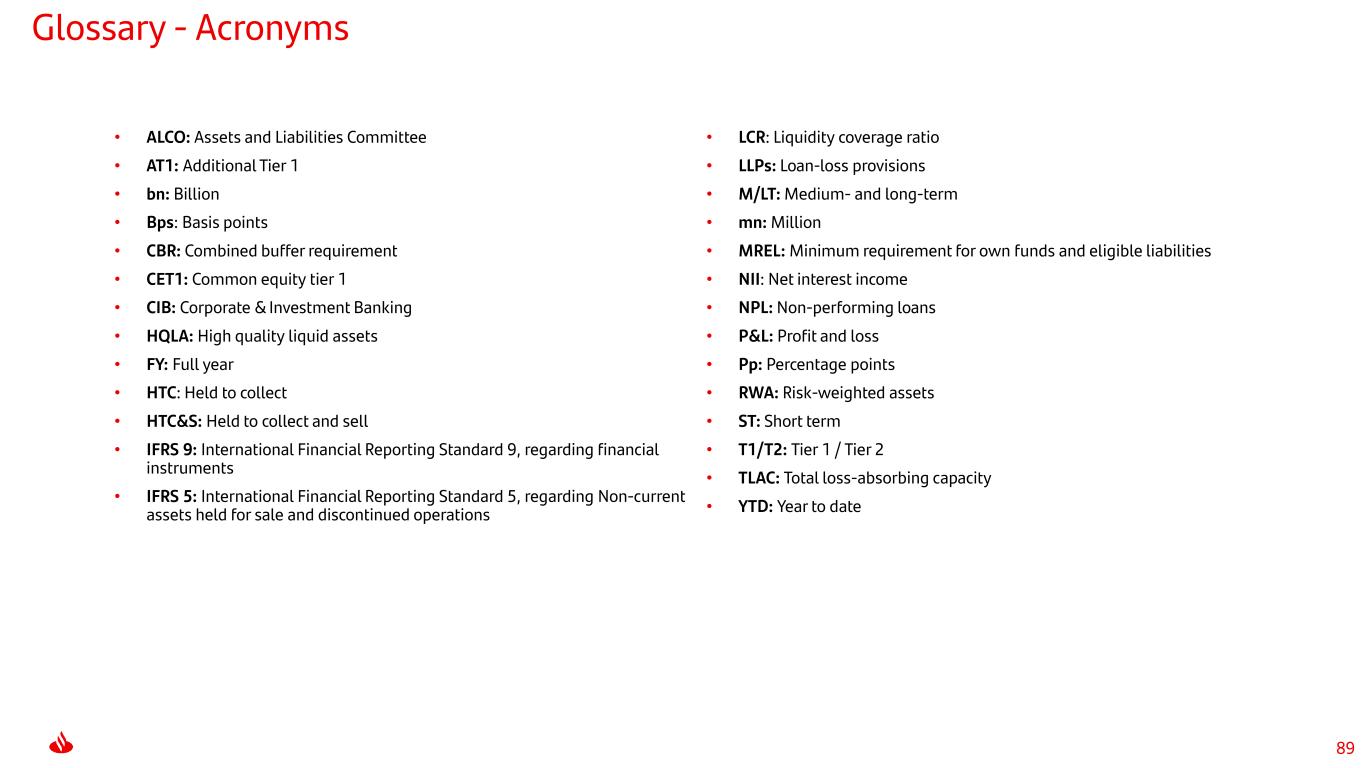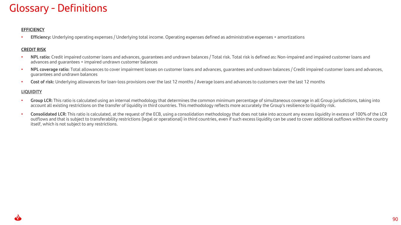89 Glossary - Acronyms • ALCO: Assets and Liabilities Committee • AT1: Additional Tier 1 • bn: Billion • Bps: Basis points • CBR: Combined buffer requirement • CET1: Common equity tier 1 • CIB: Corporate & Investment Banking • HQLA: High quality liquid assets • FY: Full year • HTC: Held to collect • HTC&S: Held to collect and sell • IFRS 9: International Financial Reporting Standard 9, regarding financial instruments • IFRS 5: International Financial Reporting Standard 5, regarding Non-current assets held for sale and discontinued operations • LCR: Liquidity coverage ratio • LLPs: Loan-loss provisions • M/LT: Medium- and long-term • mn: Million • MREL: Minimum requirement for own funds and eligible liabilities • NII: Net interest income • NPL: Non-performing loans • P&L: Profit and loss • Pp: Percentage points • RWA: Risk-weighted assets • ST: Short term • T1/T2: Tier 1 / Tier 2 • TLAC: Total loss-absorbing capacity • YTD: Year to date