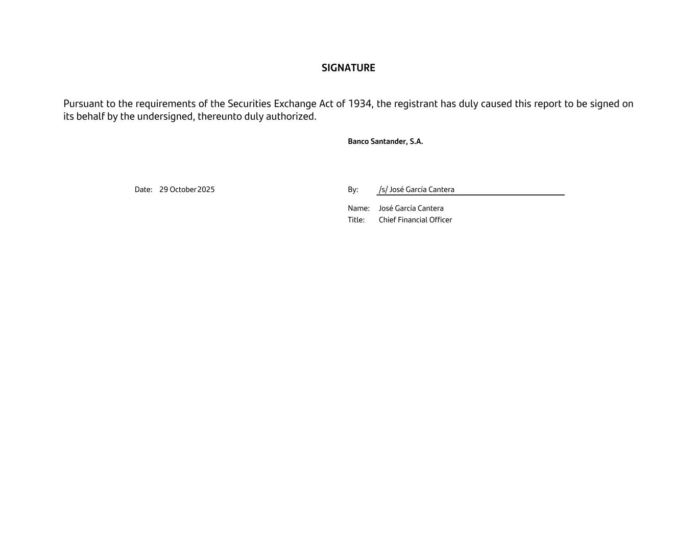 SIGNATURE Pursuant to the requirements of the Securities Exchange Act of 1934, the registrant has duly caused this report to be signed on its behalf by the undersigned, thereunto duly authorized. Banco Santander, S.A. Date: 29 October 2025 By: /s/ José García Cantera Name: José García Cantera Title: Chief Financial Officer