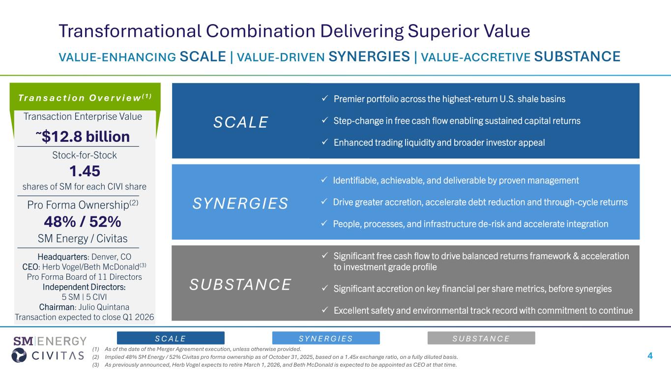 DENVER, CO November 3, 2025 - SM Energy Company (“SM Energy”) (NYSE: SM) and Civitas Resources, Inc. (“Civitas”) (NYSE: CIVI) today announced they have entered into a definitive merger agreement involving an all-stock transaction (the “Transaction”).