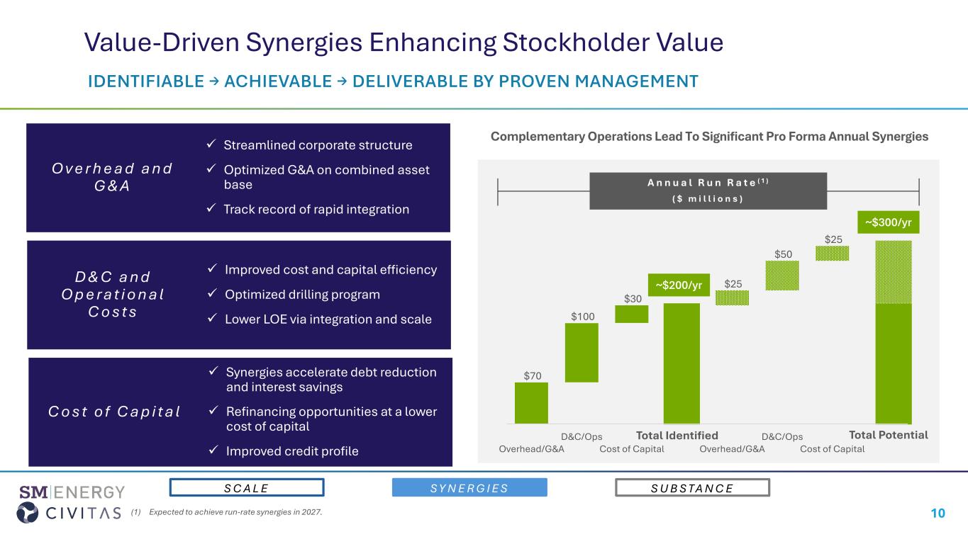 •Synergy-Enhanced Free Cash Flow. Identified and achievable annual synergies totaling $200 million, with upside potential to $300 million, is expected to enhance stockholder value. Identified synergies include opportunities across the combined organization consisting of overhead and G&A, drilling and completion and operational costs, and cost of capital. These synergies are expected to accelerate deleveraging and support a sustainable returns strategy.
