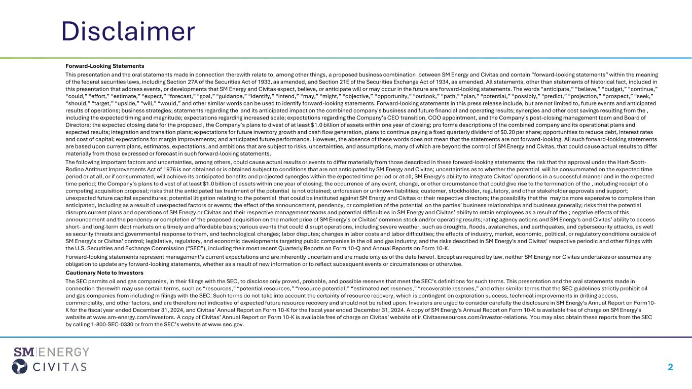 “seek,” “should,” “target,” “upside,” “will,” “would,” and other similar words can be used to identify forward-looking statements. Forward-looking statements in this press release include, but are not limited to, future events and anticipated results of operations; business strategies; statements regarding the Transaction and its anticipated impact on the combined company's business and future financial and operating results; synergies and other cost savings resulting from the Transaction, including the expected timing and magnitude; expectations regarding increased scale; expectations regarding the Company’s CEO transition, COO appointment, and the Company’s post-closing management team and Board of Directors; the expected closing date for the proposed transaction, the Company’s plans to divest of at least $1.0 billion of assets within one year of closing; pro forma descriptions of the combined company and its operational plans and expected results; integration and transition plans; expectations for future inventory growth and cash flow generation, plans to continue paying a fixed quarterly dividend of $0.20 per share; opportunities to reduce debt, interest rates and cost of capital; expectations for margin improvements; and anticipated future performance. There are a number of risks and uncertainties that could cause actual results to differ materially from the forward-looking statements included in this communication. These include the expected timing and likelihood of completion of the Transaction, including the timing, receipt and terms and conditions of any required governmental and regulatory approvals of the Transaction that could reduce anticipated benefits or cause the parties to abandon the Transaction, the ability to successfully integrate the businesses, the occurrence of any event, change or other circumstances that could give rise to the termination of the merger agreement, the possibility that stockholders of SM Energy or Civitas may not approve the Transaction, the risk that the parties may not be able to satisfy the conditions to the Transaction in a timely manner or at all, risks related to disruption of management time from ongoing business operations due to the Transaction, the risk that any announcements relating to the Transaction could have adverse effects on the market price of SM Energy’s common stock or Civitas’ common stock, the risk that the Transaction and its announcement (and future announcements related to the Transaction) could have an adverse effect on the ability of SM Energy and Civitas to retain customers and retain and hire key personnel and maintain relationships with their suppliers and customers and on their operating results and businesses generally, the risk the pending Transaction could distract management of both entities and they will incur substantial costs, the risk that problems may arise in successfully integrating the businesses of the companies, which may result in the combined company not operating as effectively and efficiently as expected, the risk that the combined company may be unable to achieve synergies or it may take longer than expected to achieve those synergies and other important factors that could cause actual results to differ materially from those projected. All such factors are difficult to predict and are beyond SM Energy’s or Civitas’ control, including those detailed in SM Energy’s annual reports on Form 10-K, quarterly reports on Form 10-Q and current reports on Form 8-K that are available on its website at www.sm-energy.com/investors and on the SEC’s website at www.sec.gov, and those detailed in Civitas’ annual reports on Form 10-K, quarterly reports on Form 10-Q and current reports on Form 8-K that are available on Civitas’ website at ir.civitasresources.com/investor-relations and on the SEC’s website at www.sec.gov. All forward-looking statements are based on assumptions that SM Energy or Civitas believe to be reasonable but that may not prove to be accurate. Such forward-looking statements are based on assumptions and analyses made by SM Energy and Civitas in light of their perceptions of current conditions, expected future developments, and other factors that SM Energy and Civitas believe are appropriate under the circumstances. These statements are subject to a number of known and unknown risks and uncertainties. Forward-looking statements are not guarantees of future performance and actual events may be materially different from those expressed or implied in the forward-looking statements. The forward-looking statements in this press release speak as of the date of this press release.
