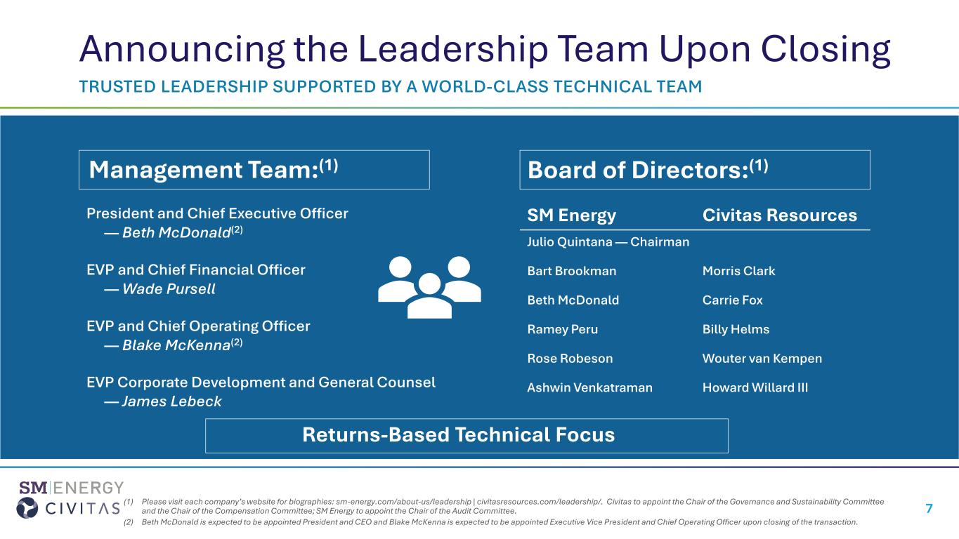 •Board of Directors Upon Transaction Closing. Upon closing of the Transaction, the Board of Directors will total 11 members and be comprised of six representatives from SM Energy and five representatives from Civitas. Julio Quintana will serve as the Non-Executive Chairman. Other members from SM Energy’s current Board of Directors will include Bart Brookman, Beth McDonald, Ramey Peru, Rose Robeson, and Ashwin Venkatraman. Members from Civitas Resources’ current Board of Directors will include Morris Clark, Carrie Fox, Billy Helms, Wouter van Kempen, and Howard Willard III.