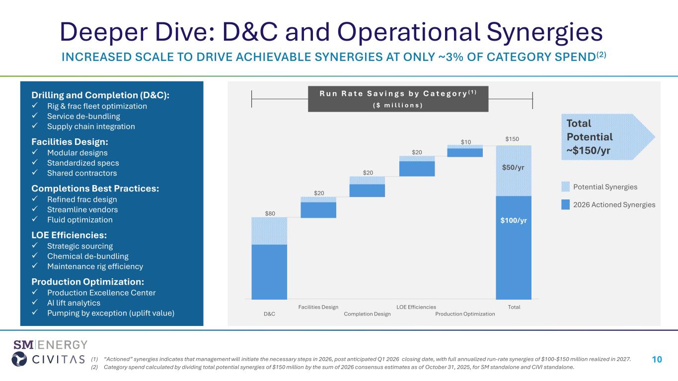 ◦Drilling and Completion and Operational Annual Synergies: $100–$150 million (2%–3% of total expected category spend). Management has identified opportunities to realize savings in all cost categories across its combined cornerstone Permian assets, along with similar expected savings across its other basins. Applying long-standing and optimized operational processes at Sweetie Peck (since 2006) and RockStar (since 2016) and across the four most recent Permian acquisitions from 2023-2025 are expected to result in enhanced capital efficiencies, further amplified by the benefits of doubling in scale. Specifically, in the drilling, completions, and production operations areas, cost benefits are anticipated from optimizing rig and frac fleets (e.g., reduced moves, lower day rates), de-bundling certain services and supplies, integrating supply chains at scale (e.g., OCTG, chemicals), implementing best practices for future wellbore and facility designs, and implementing most recent AI-driven optimization tools (e.g., artificial lift) and remote monitoring across all material acreage positions. Beyond 2027, continuous improvement and new technologies are expected to further reduce well costs and lifting costs, following historical trends.