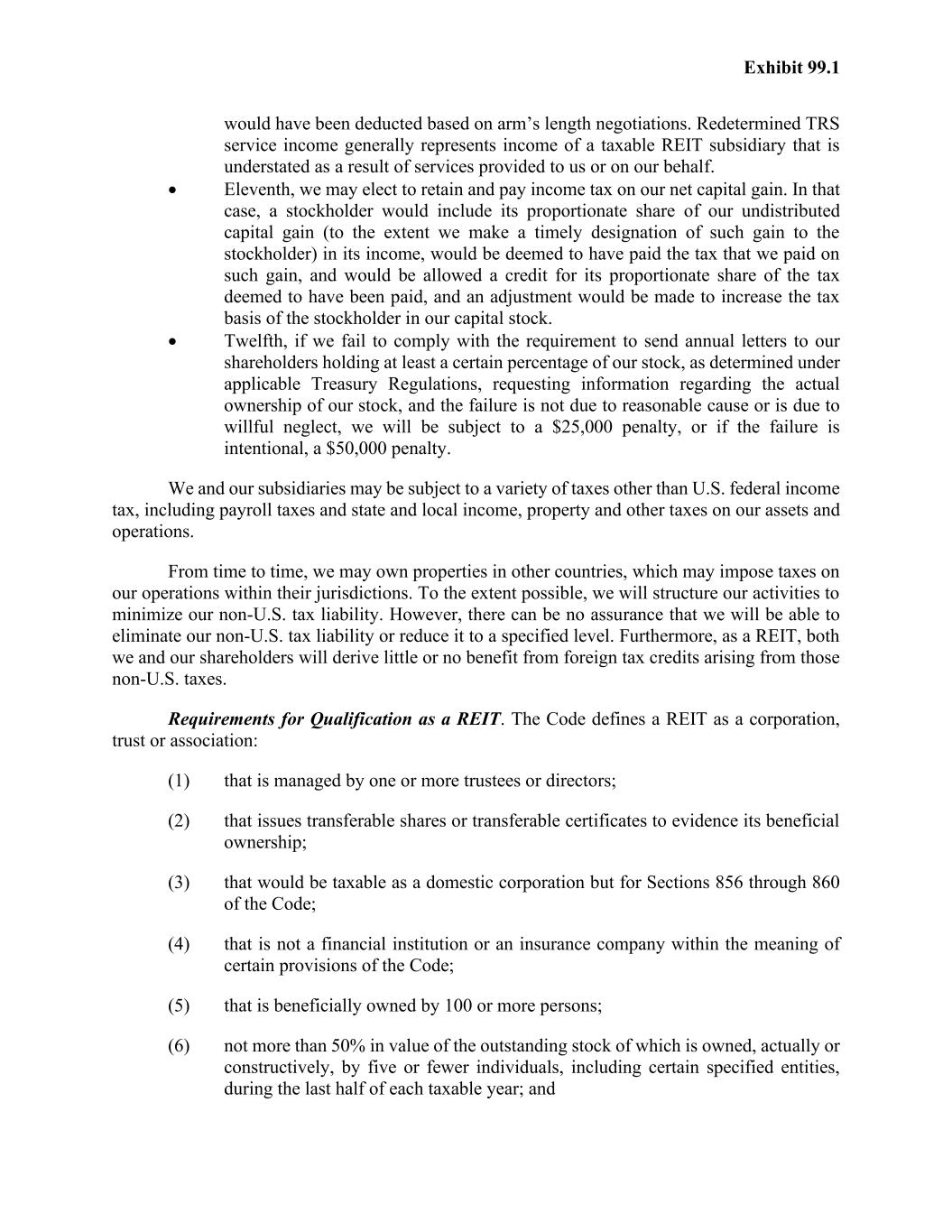 Exhibit 99.1 would have been deducted based on arm’s length negotiations. Redetermined TRS service income generally represents income of a taxable REIT subsidiary that is understated as a result of services provided to us or on our behalf. • Eleventh, we may elect to retain and pay income tax on our net capital gain. In that case, a stockholder would include its proportionate share of our undistributed capital gain (to the extent we make a timely designation of such gain to the stockholder) in its income, would be deemed to have paid the tax that we paid on such gain, and would be allowed a credit for its proportionate share of the tax deemed to have been paid, and an adjustment would be made to increase the tax basis of the stockholder in our capital stock. • Twelfth, if we fail to comply with the requirement to send annual letters to our shareholders holding at least a certain percentage of our stock, as determined under applicable Treasury Regulations, requesting information regarding the actual ownership of our stock, and the failure is not due to reasonable cause or is due to willful neglect, we will be subject to a $25,000 penalty, or if the failure is intentional, a $50,000 penalty. We and our subsidiaries may be subject to a variety of taxes other than U.S. federal income tax, including payroll taxes and state and local income, property and other taxes on our assets and operations. From time to time, we may own properties in other countries, which may impose taxes on our operations within their jurisdictions. To the extent possible, we will structure our activities to minimize our non-U.S. tax liability. However, there can be no assurance that we will be able to eliminate our non-U.S. tax liability or reduce it to a specified level. Furthermore, as a REIT, both we and our shareholders will derive little or no benefit from foreign tax credits arising from those non-U.S. taxes. Requirements for Qualification as a REIT. The Code defines a REIT as a corporation, trust or association: (1) that is managed by one or more trustees or directors; (2) that issues transferable shares or transferable certificates to evidence its beneficial ownership; (3) that would be taxable as a domestic corporation but for Sections 856 through 860 of the Code; (4) that is not a financial institution or an insurance company within the meaning of certain provisions of the Code; (5) that is beneficially owned by 100 or more persons; (6) not more than 50% in value of the outstanding stock of which is owned, actually or constructively, by five or fewer individuals, including certain specified entities, during the last half of each taxable year; and